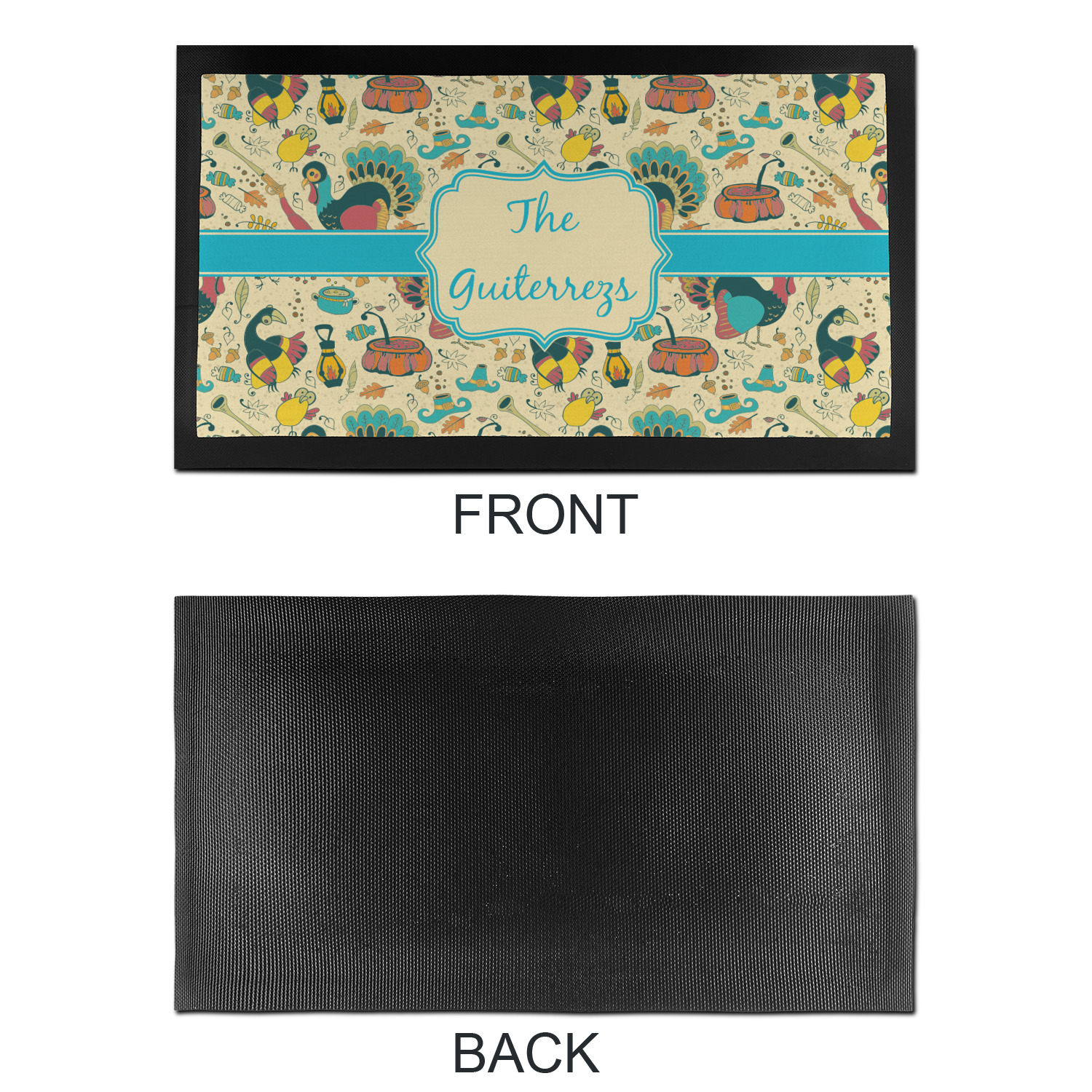 This Old Fashioned Thanksgiving design is hand drawn and includes pictures of turkey, birds, pot of food, lanterns, gun, candy, leaves and acorns; giving it a very old fashioned feel. The design has some of the traditional colors of oranges, reds and yellows, but also has a beautiful teal coloring in the turkey and the pilgrim hat; giving it a chic bold look.