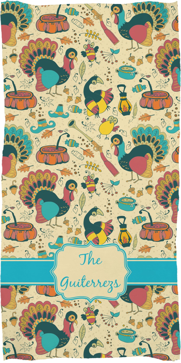 These customized bath towels are slightly larger than your standard towel and are the ideal size for wrapping around your body. They measure approximately 60" x 30". Your customization is displayed across the entire front face of the towel, while the back is white.