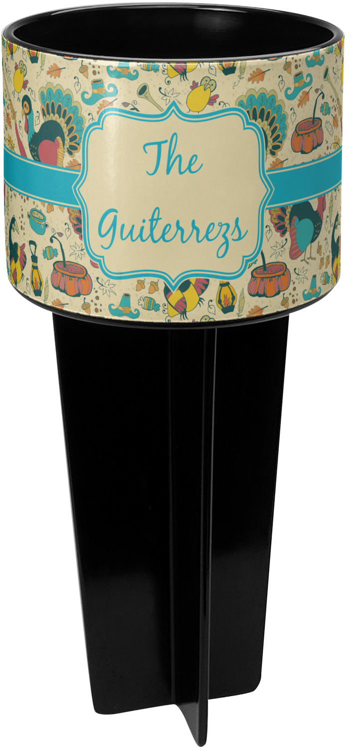 This cup holder has a large stake at its bottom that anchors it to the sand or ground below, while the cup holder rests above the stake. The entire drink holder is made of durable plastic and displays your customization around the cup holder portion. We sell these personalized beach spikers in two different colors: black and white.