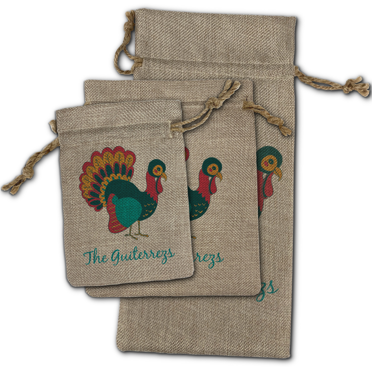 We sell our Burlap Gift Bags in 3 variant sized bags. Made with burlap polyester, each personalized bag can be secured with a twine drawstring pull. Your custom design is available to print on one side or both sides - completely up to you! The sizes of the bags measure approximately 4.5" x 6.5" for the smallest size, 6.5" x 8.0" for the medium size, and 6.5" x 13.5" for the large-sized bag.