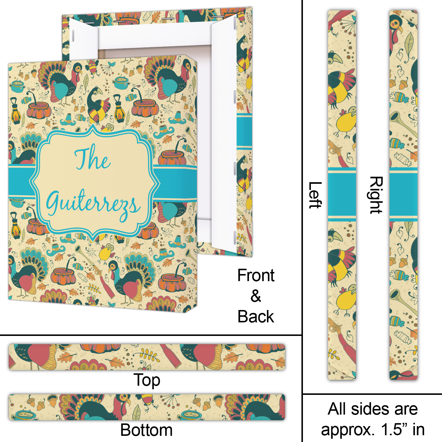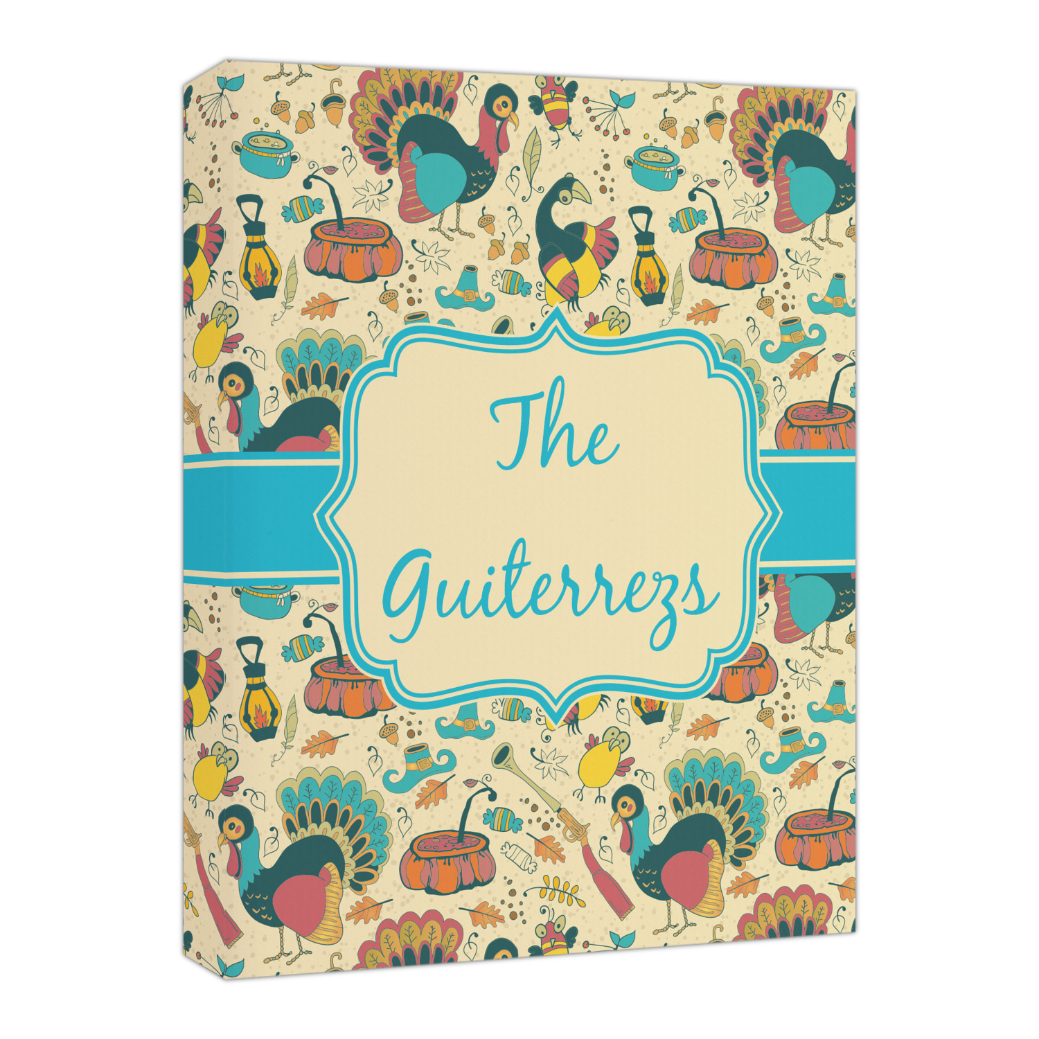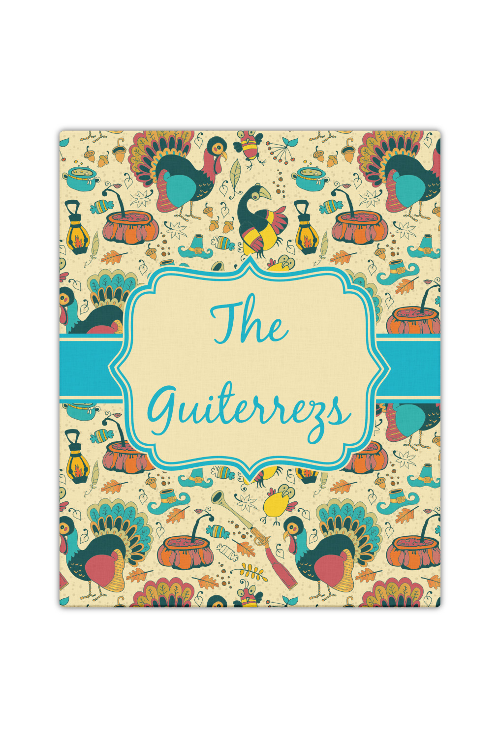 This Old Fashioned Thanksgiving design is hand drawn and includes pictures of turkey, birds, pot of food, lanterns, gun, candy, leaves and acorns; giving it a very old fashioned feel. The design has some of the traditional colors of oranges, reds and yellows, but also has a beautiful teal coloring in the turkey and the pilgrim hat; giving it a chic bold look.