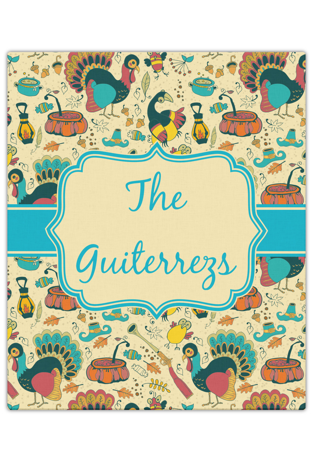 This Old Fashioned Thanksgiving design is hand drawn and includes pictures of turkey, birds, pot of food, lanterns, gun, candy, leaves and acorns; giving it a very old fashioned feel. The design has some of the traditional colors of oranges, reds and yellows, but also has a beautiful teal coloring in the turkey and the pilgrim hat; giving it a chic bold look.