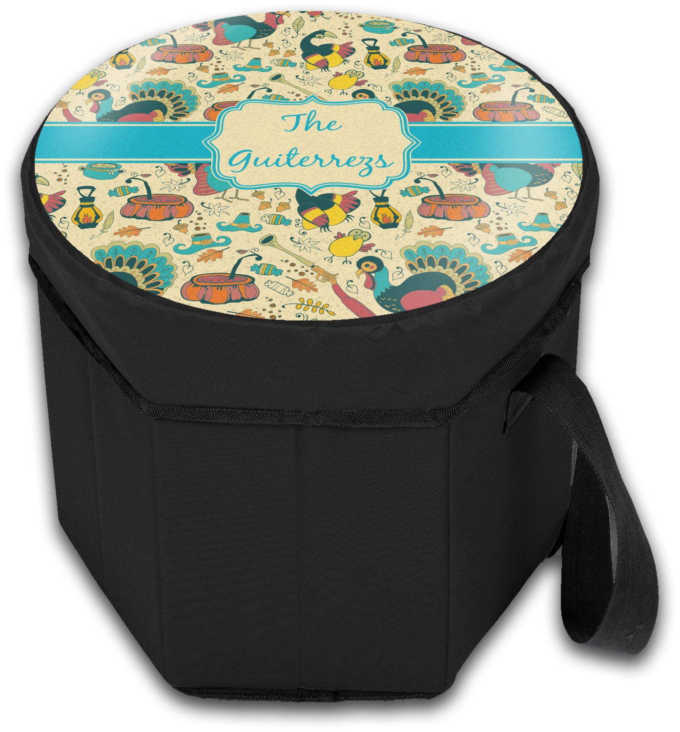 Our collapsible insulated coolers feature a unique six-sided hexagon shape, are lightweight, durable and can be turned into a seat. This cooler is fully insulated with silver foil lining to keep food and drinks hot or cold, and has a 12-quart capacity. Although this cooler collapses for easy transport, hidden inside are composition panels made of sturdy wood that give the frame strength and allow this cooler to be used as a seat. Simply sit down on the personalized cover and give your legs a break! (Maximum weight capacity of 200 pounds.)