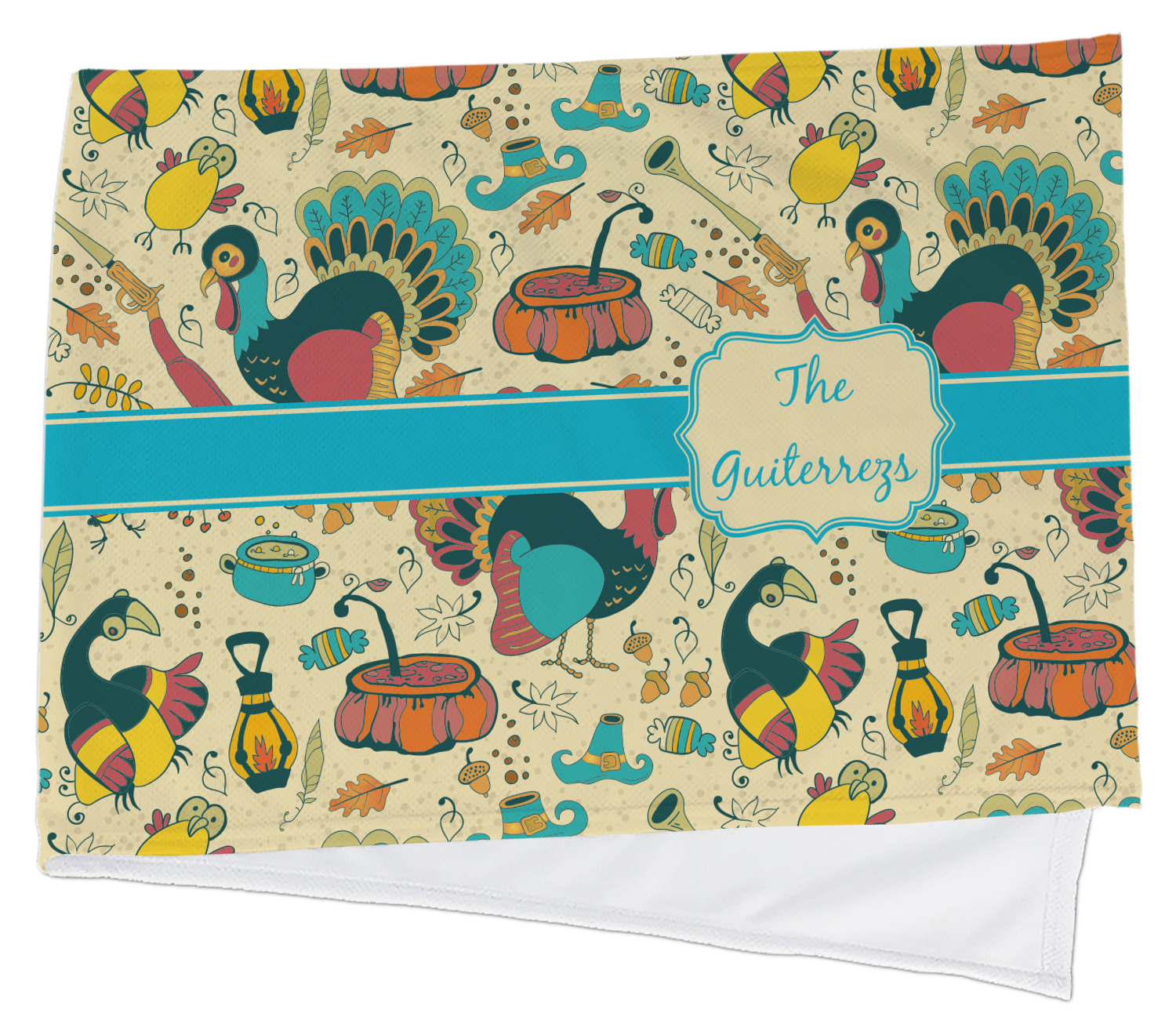 This Old Fashioned Thanksgiving design is hand drawn and includes pictures of turkey, birds, pot of food, lanterns, gun, candy, leaves and acorns; giving it a very old fashioned feel. The design has some of the traditional colors of oranges, reds and yellows, but also has a beautiful teal coloring in the turkey and the pilgrim hat; giving it a chic bold look.