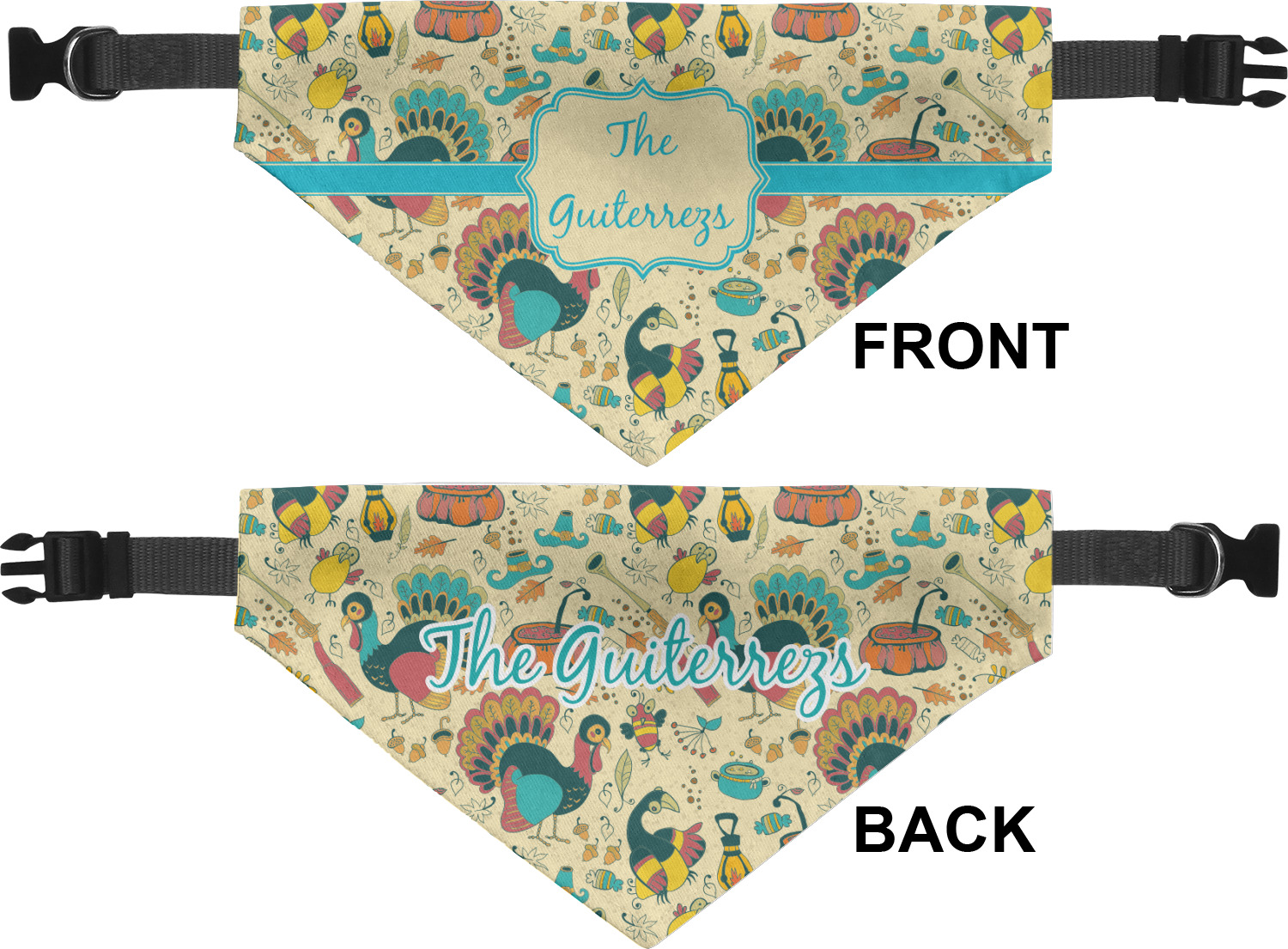 We print the front and back of these dog bandanas with your customized design. The bandana itself is made from a durable polyester, sewn together with a gap large enough to accommodate any collar. Regardless, the bandana includes a plain black, canvas collar with plastic snaps, that can easily be removed if desired. These dog bandana collars are available in four sizes: small, medium, large, and extra large. Please see our sizing chart for more information regarding the dimensions of each size.