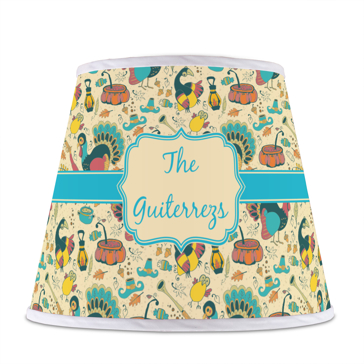 This Old Fashioned Thanksgiving design is hand drawn and includes pictures of turkey, birds, pot of food, lanterns, gun, candy, leaves and acorns; giving it a very old fashioned feel. The design has some of the traditional colors of oranges, reds and yellows, but also has a beautiful teal coloring in the turkey and the pilgrim hat; giving it a chic bold look.