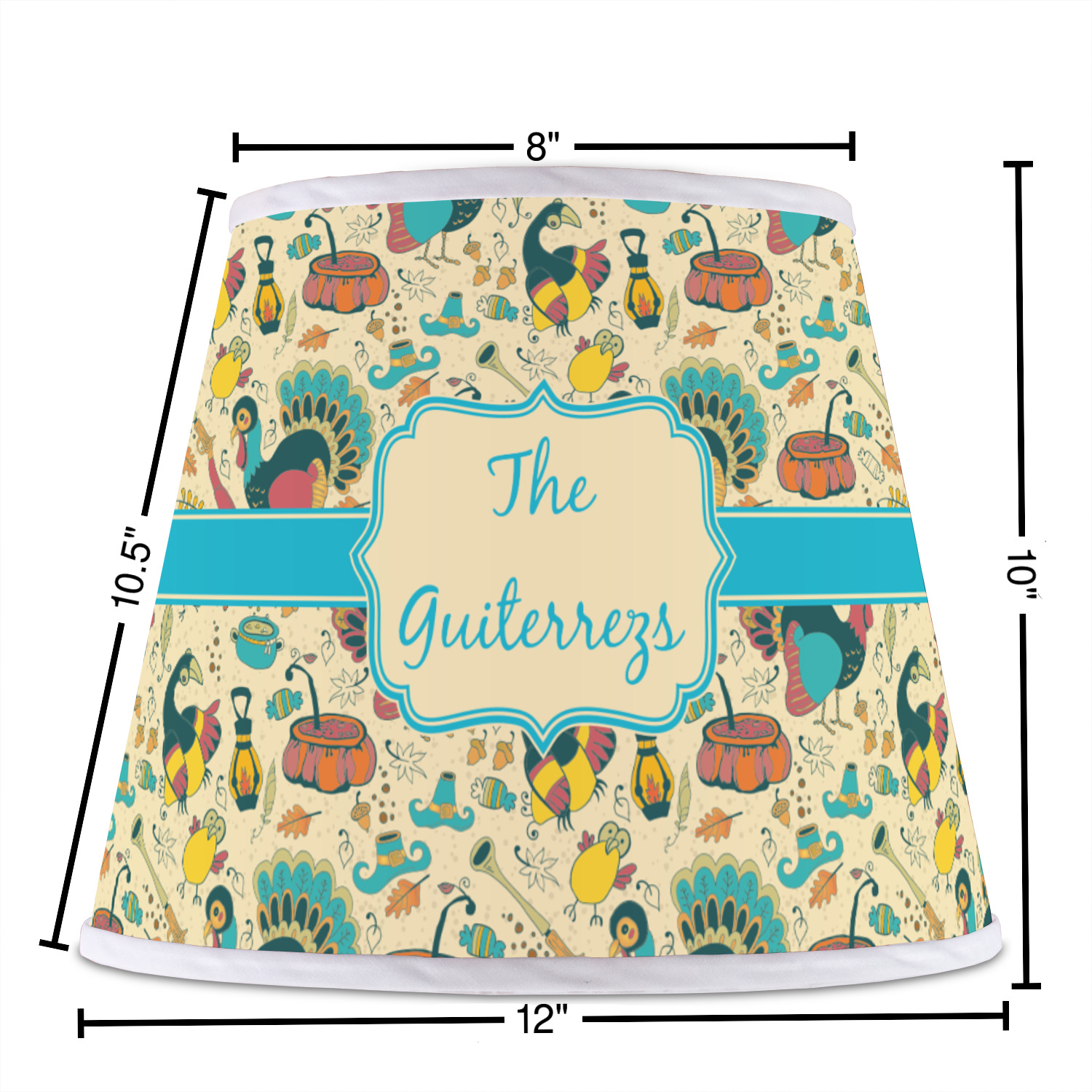 The base of this lampshade is 12 inches in diameter, and the top spans 8 inches in diameter. The total height of the lampshade is 10 inches. The angled nature of this custom lampshade concentrates the light, making it ideal for smaller spaces. This lampshade is made of matte, polyfilm, and displays your customization in its middle. The top and bottom of this colorful lamp shade are lined with a white fabric ribbon (which can be replaced with black inside the design studio) which frames your design and creates a sophisticated finish. As an UNO fitter lampshade, this unique lamp shade will fit a variety of bases.