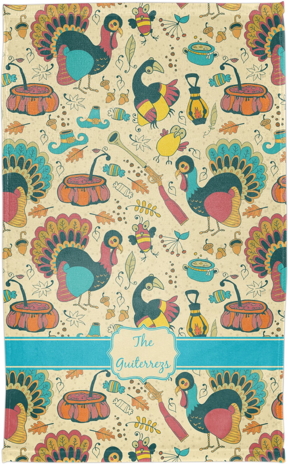 This Old Fashioned Thanksgiving design is hand drawn and includes pictures of turkey, birds, pot of food, lanterns, gun, candy, leaves and acorns; giving it a very old fashioned feel. The design has some of the traditional colors of oranges, reds and yellows, but also has a beautiful teal coloring in the turkey and the pilgrim hat; giving it a chic bold look.