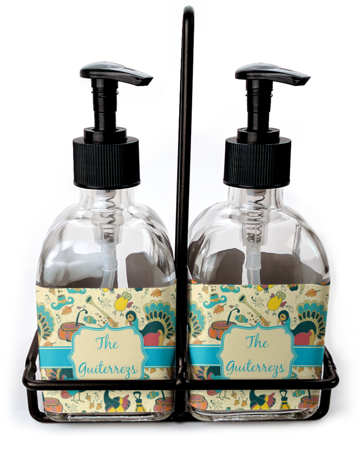 You can purchase these personalized soap dispensers as singulars, or as a set with two bottles. With your purchase of the set, we include a black frame that complements the black color of the pumps and adds to the overall classy look of the piece.