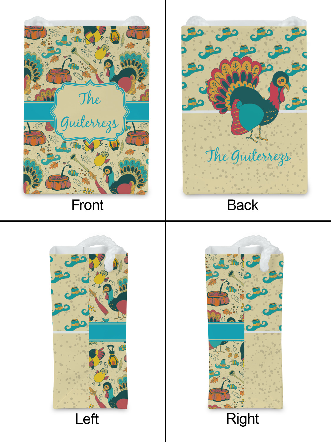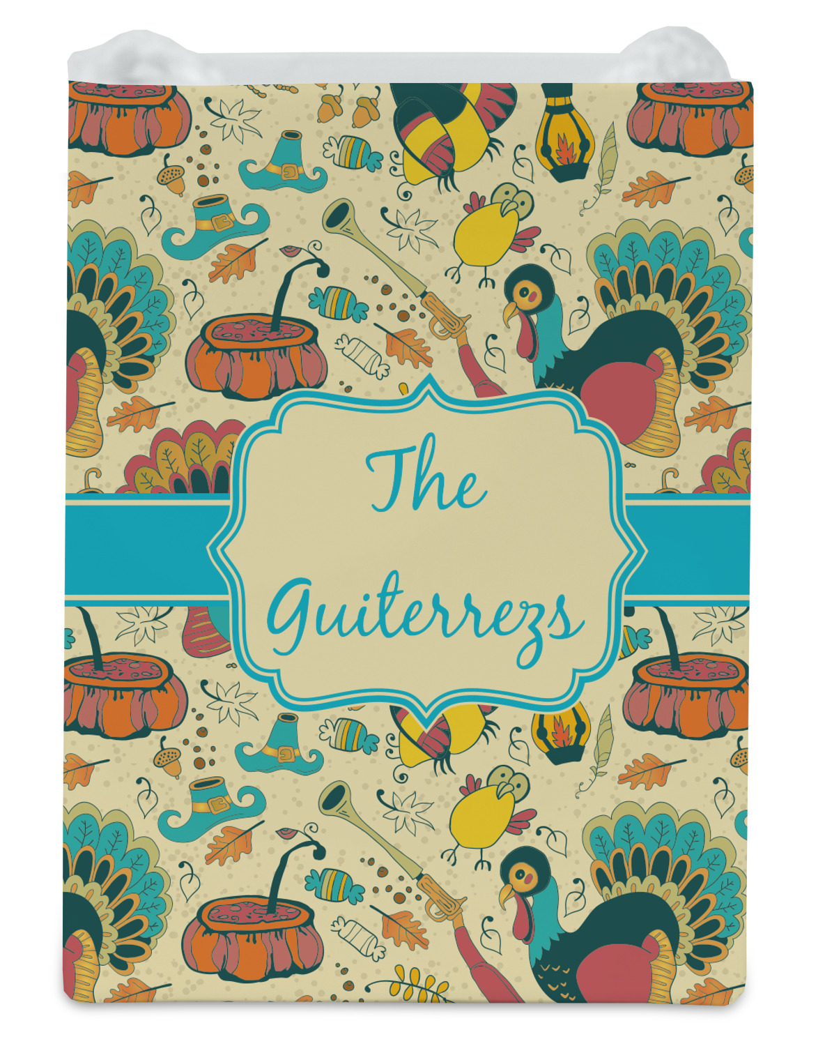 This Old Fashioned Thanksgiving design is hand drawn and includes pictures of turkey, birds, pot of food, lanterns, gun, candy, leaves and acorns; giving it a very old fashioned feel. The design has some of the traditional colors of oranges, reds and yellows, but also has a beautiful teal coloring in the turkey and the pilgrim hat; giving it a chic bold look.