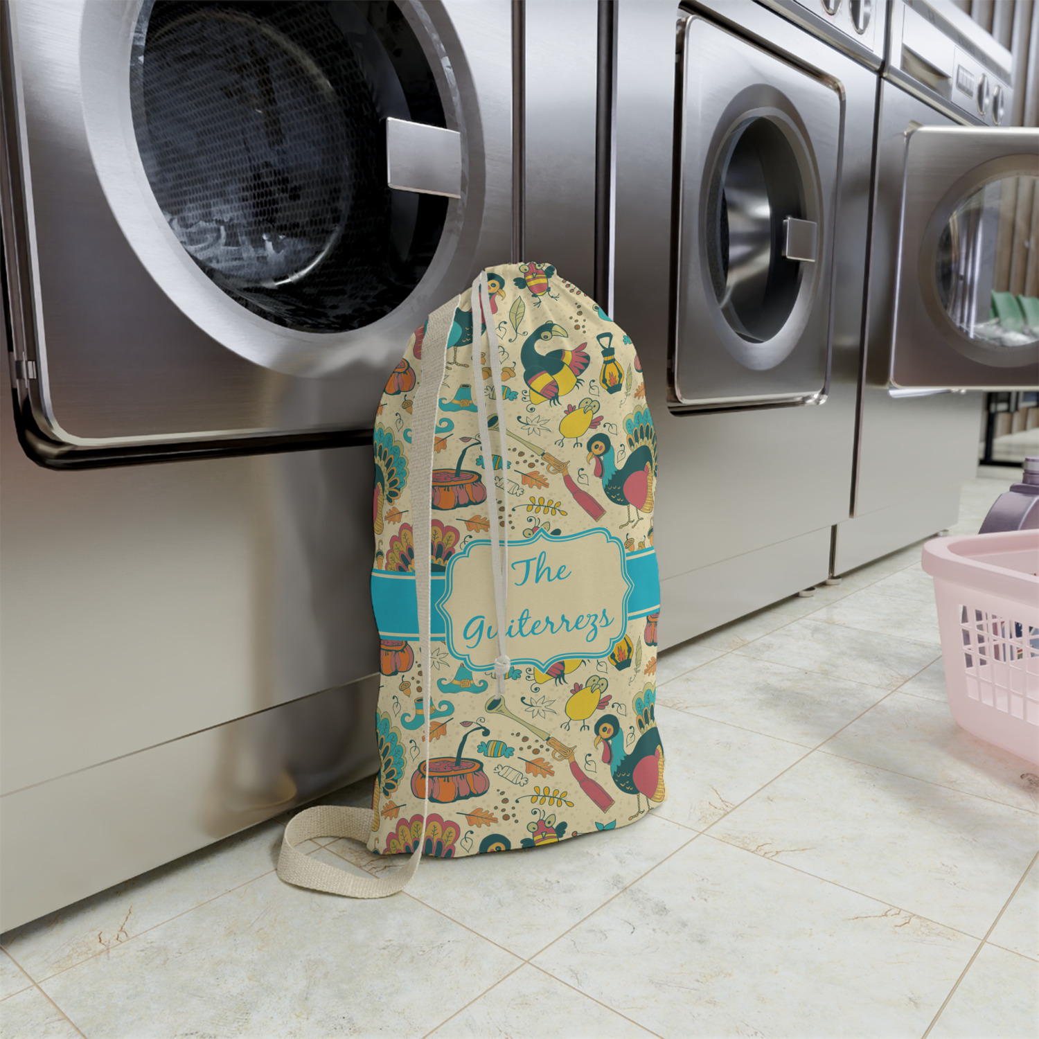 Carry your laundry in style with these customized laundry bags. Available in two sizes, featuring a natural colored woven strap and a cinch cord, these bags hold a lot of clothes or anything else you want to fit in them.
