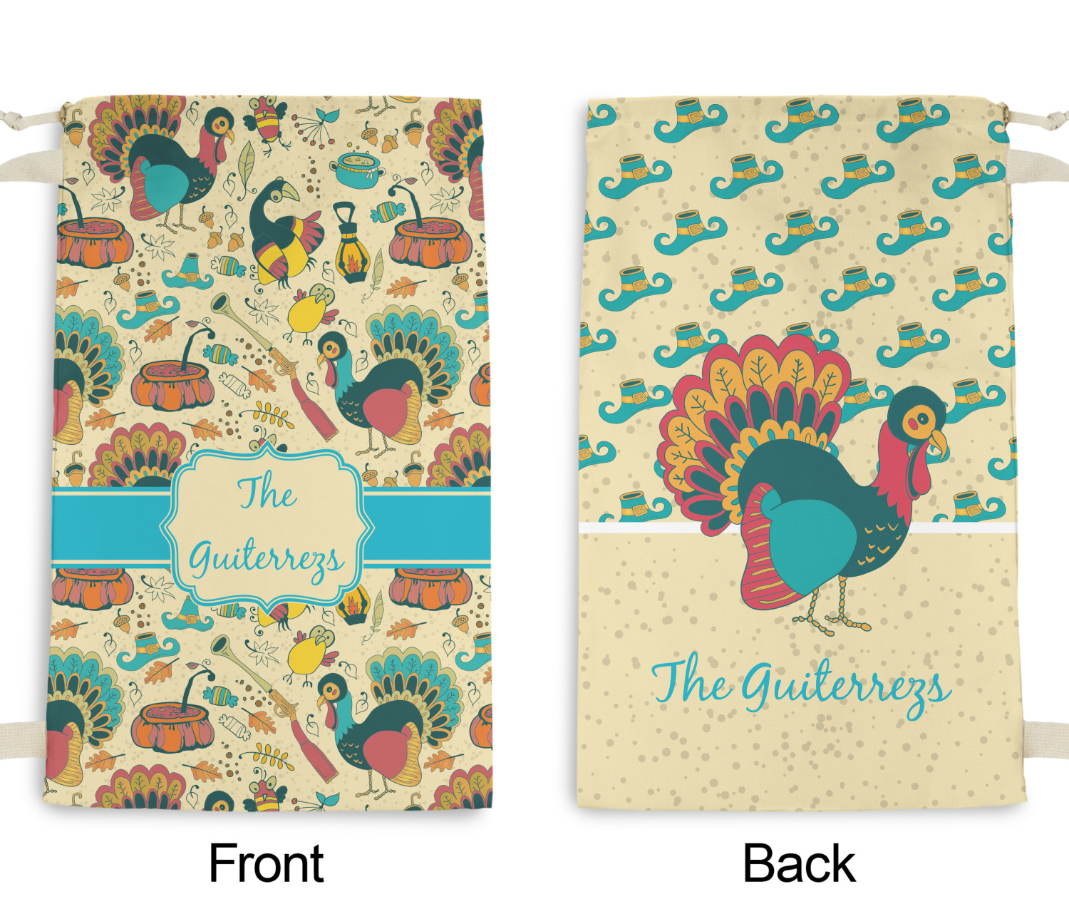 This Old Fashioned Thanksgiving design is hand drawn and includes pictures of turkey, birds, pot of food, lanterns, gun, candy, leaves and acorns; giving it a very old fashioned feel. The design has some of the traditional colors of oranges, reds and yellows, but also has a beautiful teal coloring in the turkey and the pilgrim hat; giving it a chic bold look.