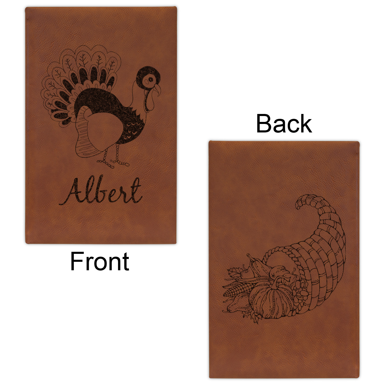 The faux leather covers are a rich cognac / rawhide color and can be customized with your design. From a simple name or monogram or a logo to a detailed mandala - the choice for customization & personalization is truly yours. Customize one of our designs or upload your own.