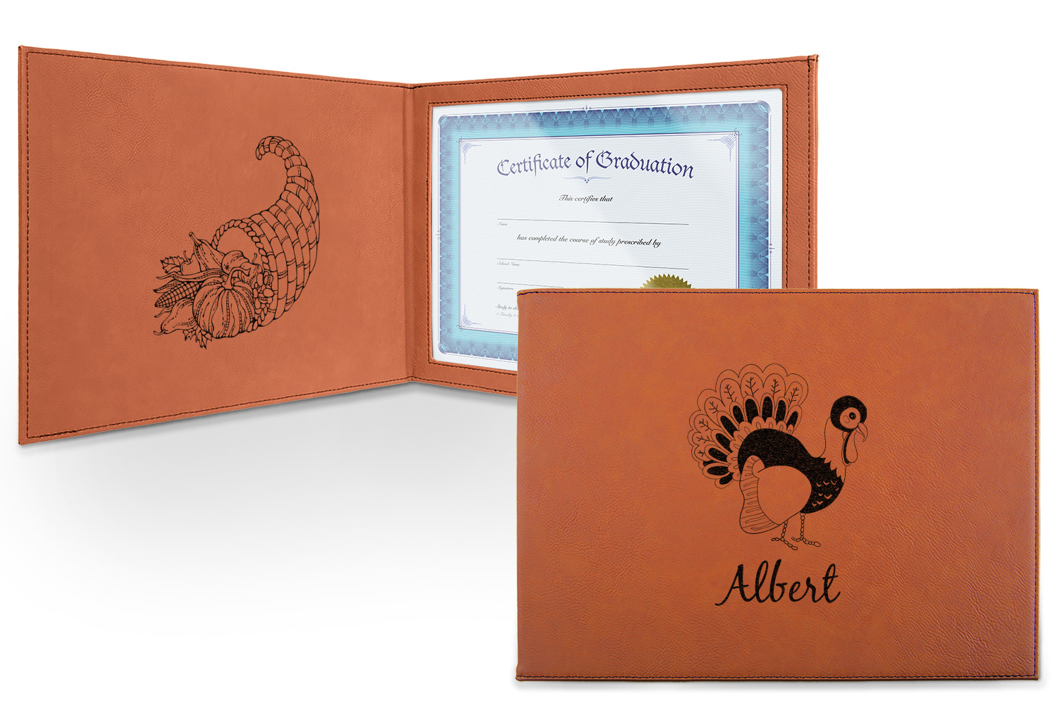 This cognac-colored, leatherette certificate jacket is the ideal way to display or store your hard-earned certificate. When closed, the custom certificate holder measures at 12 by 9 inches. The interior of the certificate cover includes a clear, vinyl window to encase your diploma. The window measures at around 10.5 by 7.5 inches and can accommodate a diploma that measures at up to 8.5 by 11 inches. You can either choose to have your customization laser engraved on the front and interior, or solely the front.