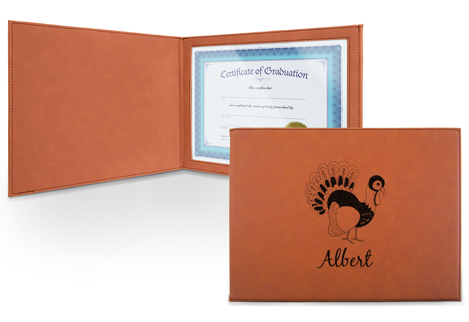 This cognac-colored, leatherette certificate jacket is the ideal way to display or store your hard-earned certificate. When closed, the custom certificate holder measures at 12 by 9 inches. The interior of the certificate cover includes a clear, vinyl window to encase your diploma. The window measures at around 10.5 by 7.5 inches and can accommodate a diploma that measures at up to 8.5 by 11 inches. You can either choose to have your customization laser engraved on the front and interior, or solely the front.
