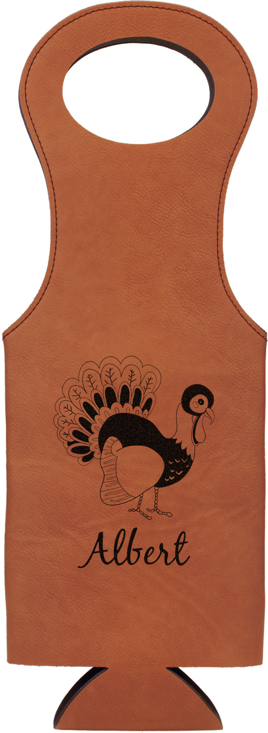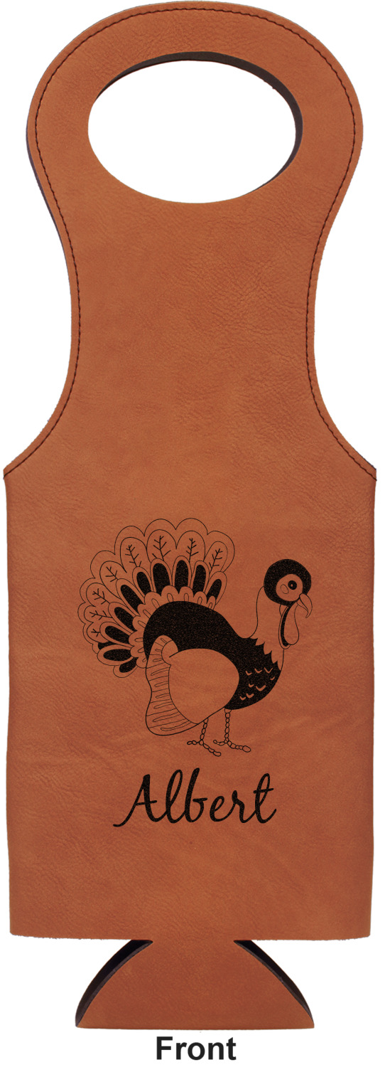 This wine carrier is made from a stunning leatherette, in a cognac-brown color. Strong, black stitching lines the sides of your wine bottle bag and provides extra durability. The interior is lined with a padded, black material to allow for a snug fit once your bottle is placed inside. At the top of this wine gift bag, you'll find two oval shaped handles that elegantly complements the rest of the bag's style. We provide you with the option of laser-engraving the front, or the front and back of your new personalized wine bag!