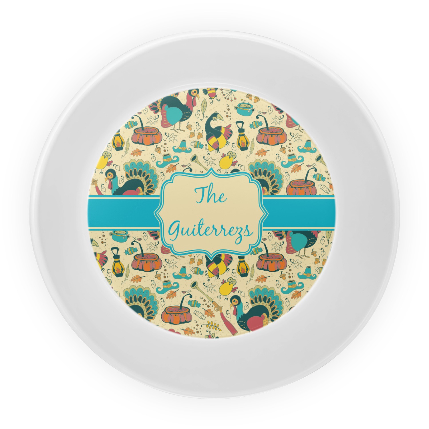 This Old Fashioned Thanksgiving design is hand drawn and includes pictures of turkey, birds, pot of food, lanterns, gun, candy, leaves and acorns; giving it a very old fashioned feel. The design has some of the traditional colors of oranges, reds and yellows, but also has a beautiful teal coloring in the turkey and the pilgrim hat; giving it a chic bold look.
