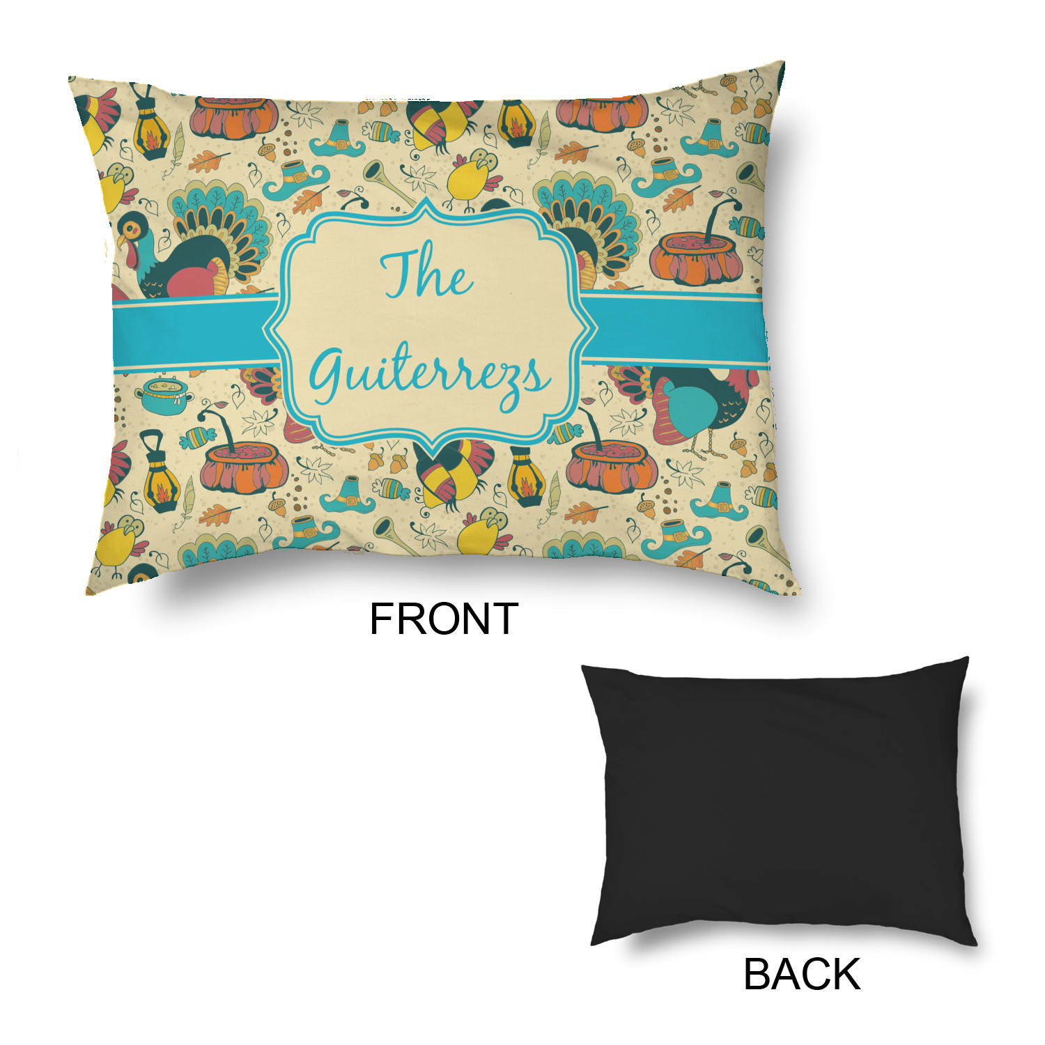 This Old Fashioned Thanksgiving design is hand drawn and includes pictures of turkey, birds, pot of food, lanterns, gun, candy, leaves and acorns; giving it a very old fashioned feel. The design has some of the traditional colors of oranges, reds and yellows, but also has a beautiful teal coloring in the turkey and the pilgrim hat; giving it a chic bold look.