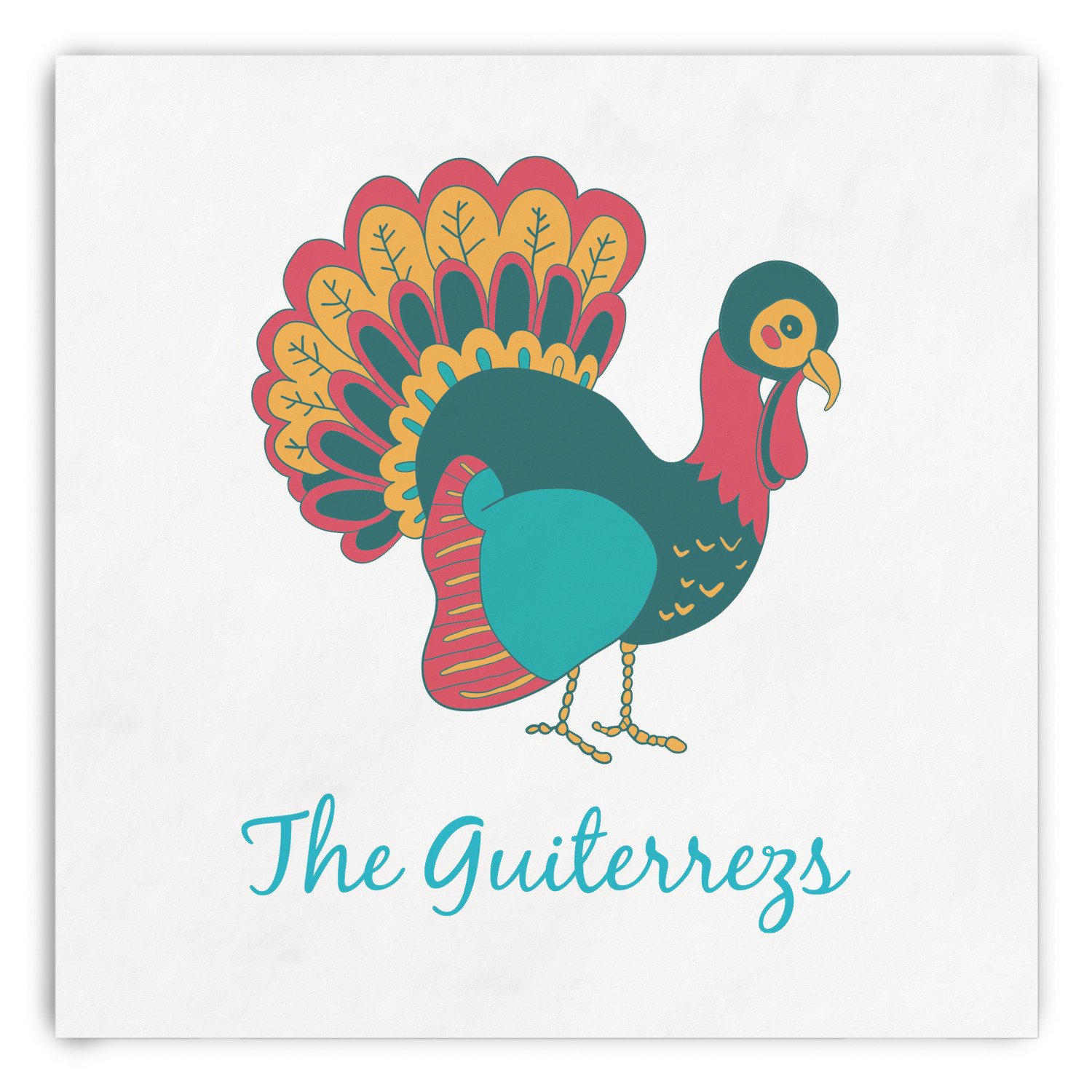 The background is fully re-color-able, so we choose a light yellow and we accented it with teal ribbon and a decorative label in teal and light yellow. We used a family personalization in teal as well.