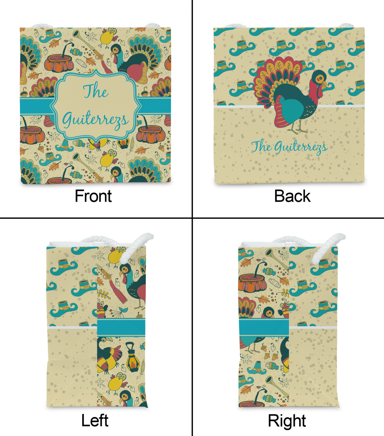This Old Fashioned Thanksgiving design is hand drawn and includes pictures of turkey, birds, pot of food, lanterns, gun, candy, leaves and acorns; giving it a very old fashioned feel. The design has some of the traditional colors of oranges, reds and yellows, but also has a beautiful teal coloring in the turkey and the pilgrim hat; giving it a chic bold look.