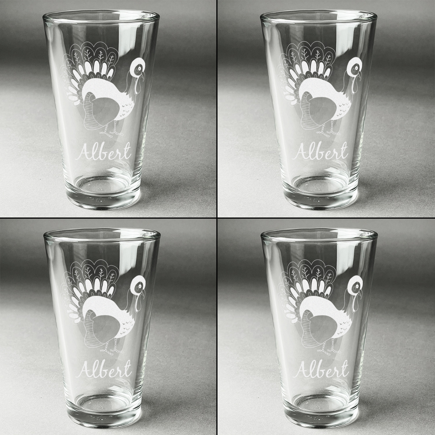 Available in a single glass or a set of 4 - each glass will be custom engraved with your design. Each glass holds 16 oz and measure 5.75"H x 3.5"W.
