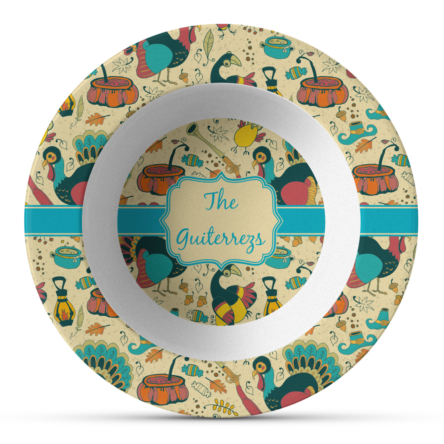 Made from a composite, thermo-set, polymer plastic, these dinner bowls have the versatility, durability, and weight of a melamine bowl without any of the downsides of melamine. Unlike melamine dinnerware, these bowls can withstand high heat. These custom plastic bowls can even handle temperatures of up to 250 degrees Fahrenheit, for up to 60 minutes. The pieces of our plastic dinner set are never made with harmful chemicals, such as BPAs, formaldehyde, DEHPs. We display your personalization on the base of this bowl's interior, while the bowl itself has an 8.75" diameter and is 1.75" tall.