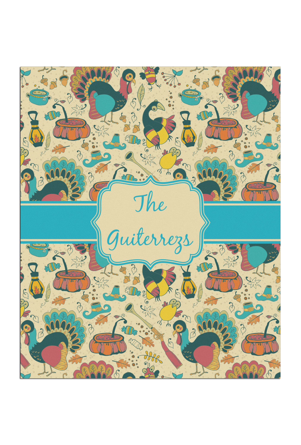 This Old Fashioned Thanksgiving design is hand drawn and includes pictures of turkey, birds, pot of food, lanterns, gun, candy, leaves and acorns; giving it a very old fashioned feel. The design has some of the traditional colors of oranges, reds and yellows, but also has a beautiful teal coloring in the turkey and the pilgrim hat; giving it a chic bold look.