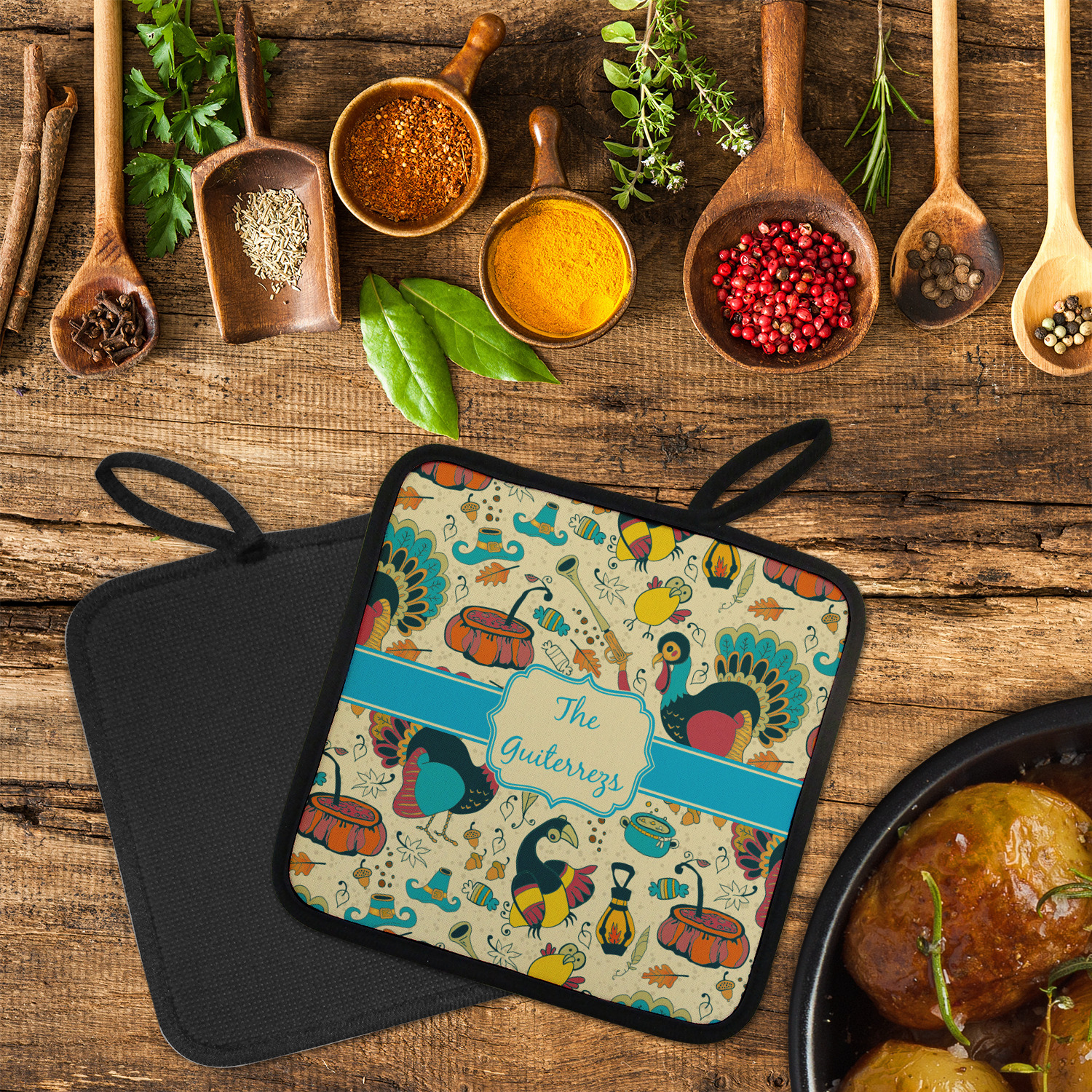 Our personalized pot holders feature a neoprene front that displays your personalization in vibrant colors. The backing of the hot pot holder is rubberized; the textured backing allows you to have a great grip when using this custom pot holder. The two materials are joined with a sleek, black trim, and the holder also includes an attached loop for hanging and storage. The pot holder is approximately 8.75 inches by 8.75 inches and 0.25 inches tall, while the fabric loop is 2.5 inches long. You can purchase a kitchen pot holder by itself or as a set of 2. We also offer a set including one pot holder and one oven mitt.