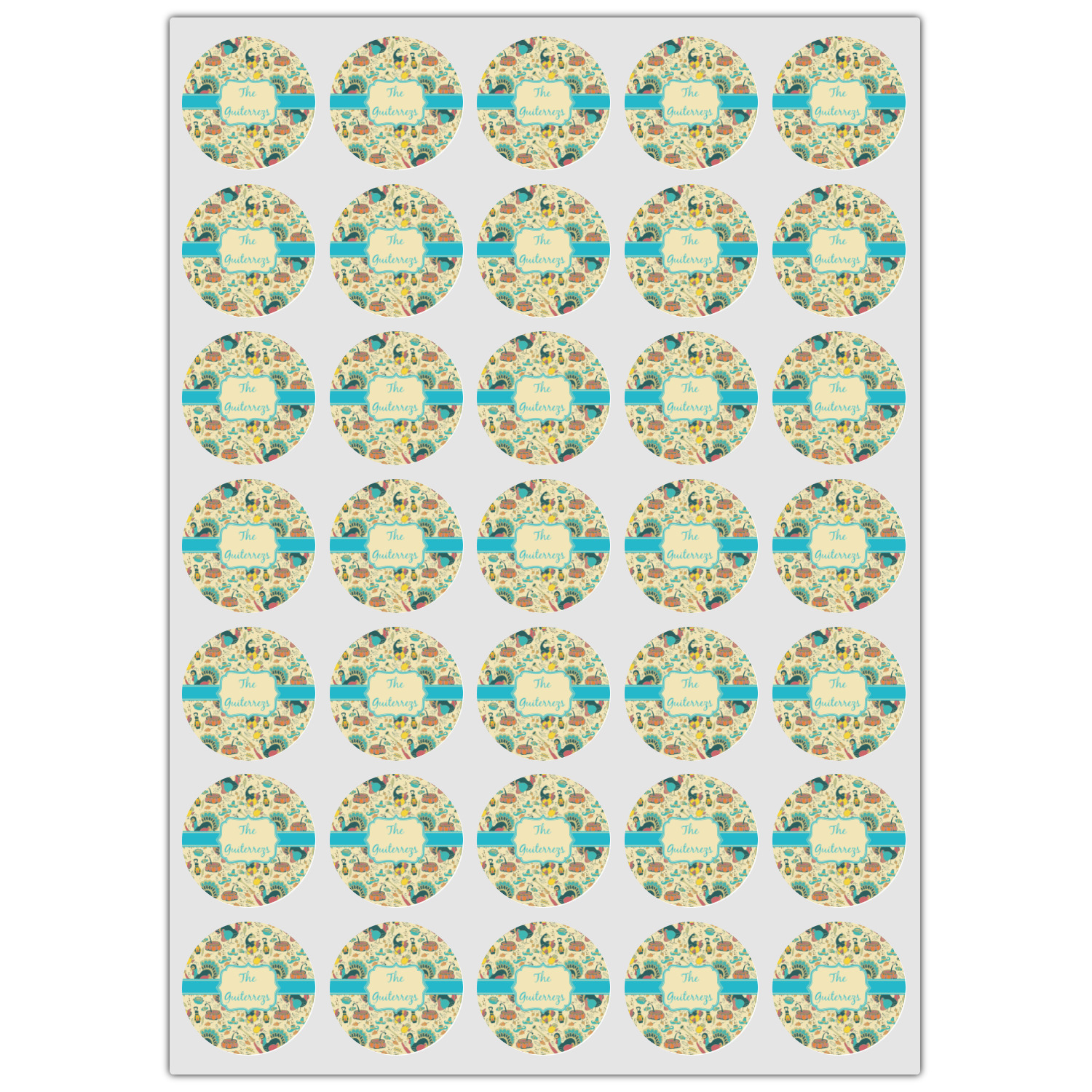 This Old Fashioned Thanksgiving design is hand drawn and includes pictures of turkey, birds, pot of food, lanterns, gun, candy, leaves and acorns; giving it a very old fashioned feel. The design has some of the traditional colors of oranges, reds and yellows, but also has a beautiful teal coloring in the turkey and the pilgrim hat; giving it a chic bold look.