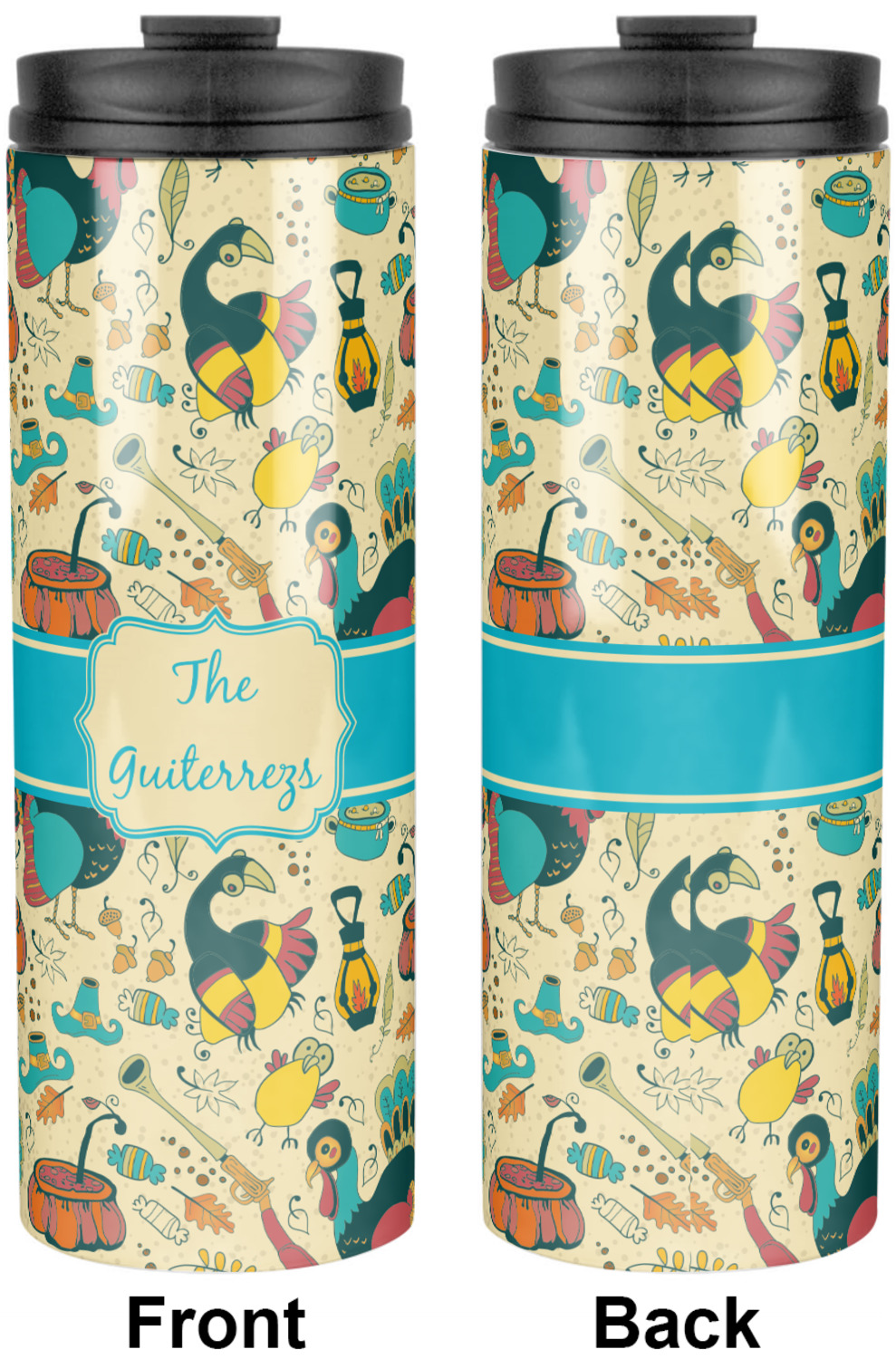 This Old Fashioned Thanksgiving design is hand drawn and includes pictures of turkey, birds, pot of food, lanterns, gun, candy, leaves and acorns; giving it a very old fashioned feel. The design has some of the traditional colors of oranges, reds and yellows, but also has a beautiful teal coloring in the turkey and the pilgrim hat; giving it a chic bold look.
