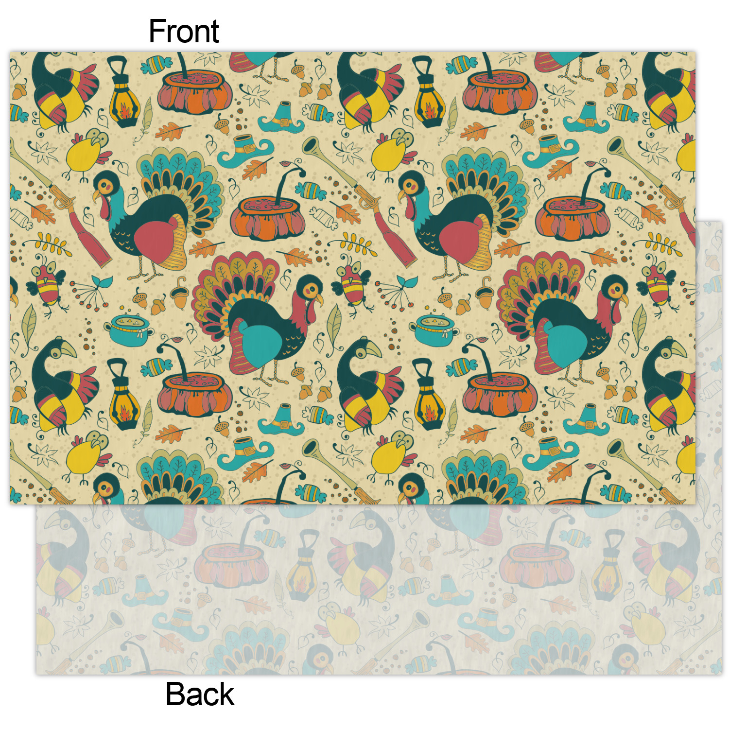 This Old Fashioned Thanksgiving design is hand drawn and includes pictures of turkey, birds, pot of food, lanterns, gun, candy, leaves and acorns; giving it a very old fashioned feel. The design has some of the traditional colors of oranges, reds and yellows, but also has a beautiful teal coloring in the turkey and the pilgrim hat; giving it a chic bold look.