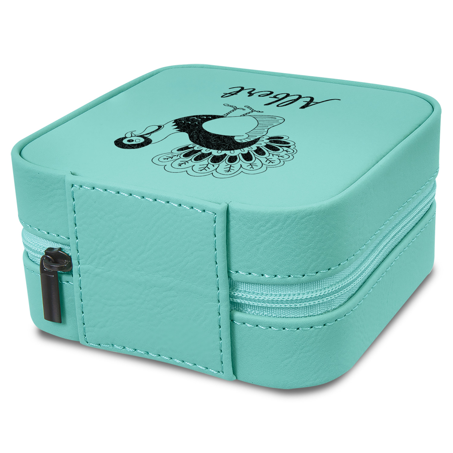 This square zippered travel jewelry box is made from leatherette and is available in four colors - classic cognac / rawhide, a beautiful teal. navy blue or pink. The tan colored soft velvet inside has compartments and hooks for all your jewelry - rings, chains, earrings, bangles etc.