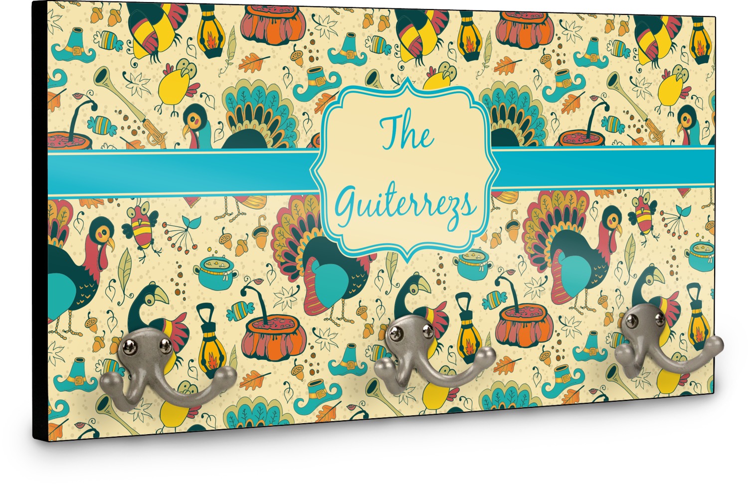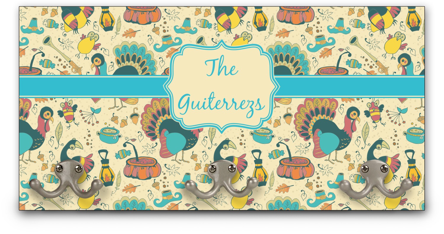 This coat rack is the perfect way to add some personality to your wall or entryway. The board is made of a strong maple that is approximately 16" x 8". The three 2-prong hooks are a sturdy metal that have three screws attaching them to the board. Your design is printed right onto the front of the board while the back and sides are a simple black.