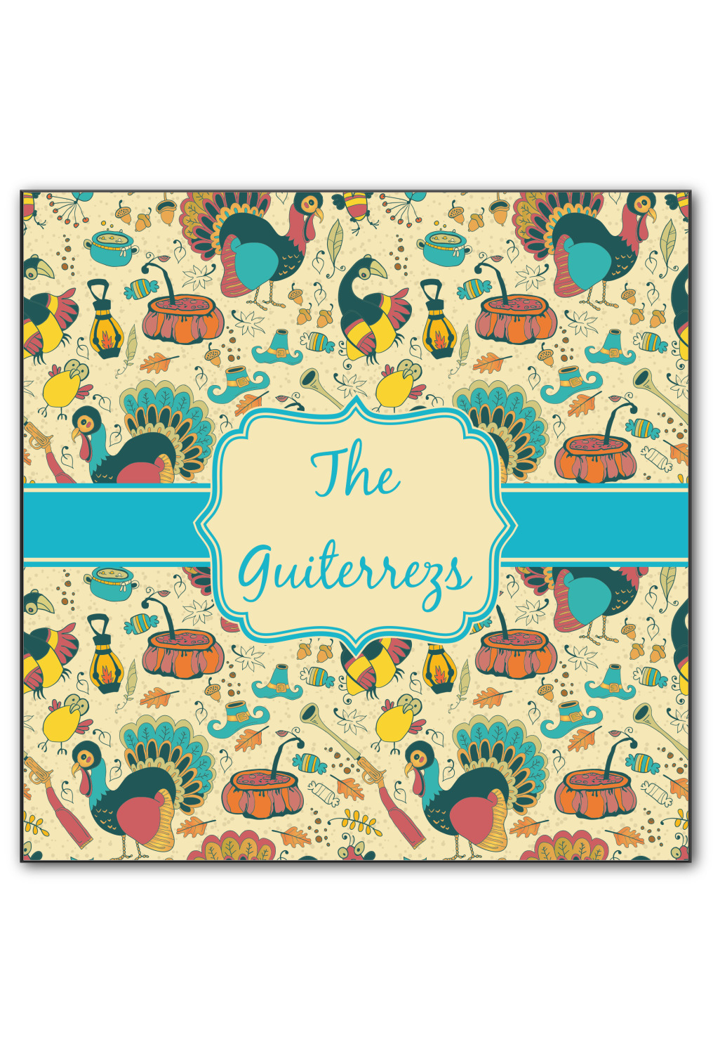 This Old Fashioned Thanksgiving design is hand drawn and includes pictures of turkey, birds, pot of food, lanterns, gun, candy, leaves and acorns; giving it a very old fashioned feel. The design has some of the traditional colors of oranges, reds and yellows, but also has a beautiful teal coloring in the turkey and the pilgrim hat; giving it a chic bold look.