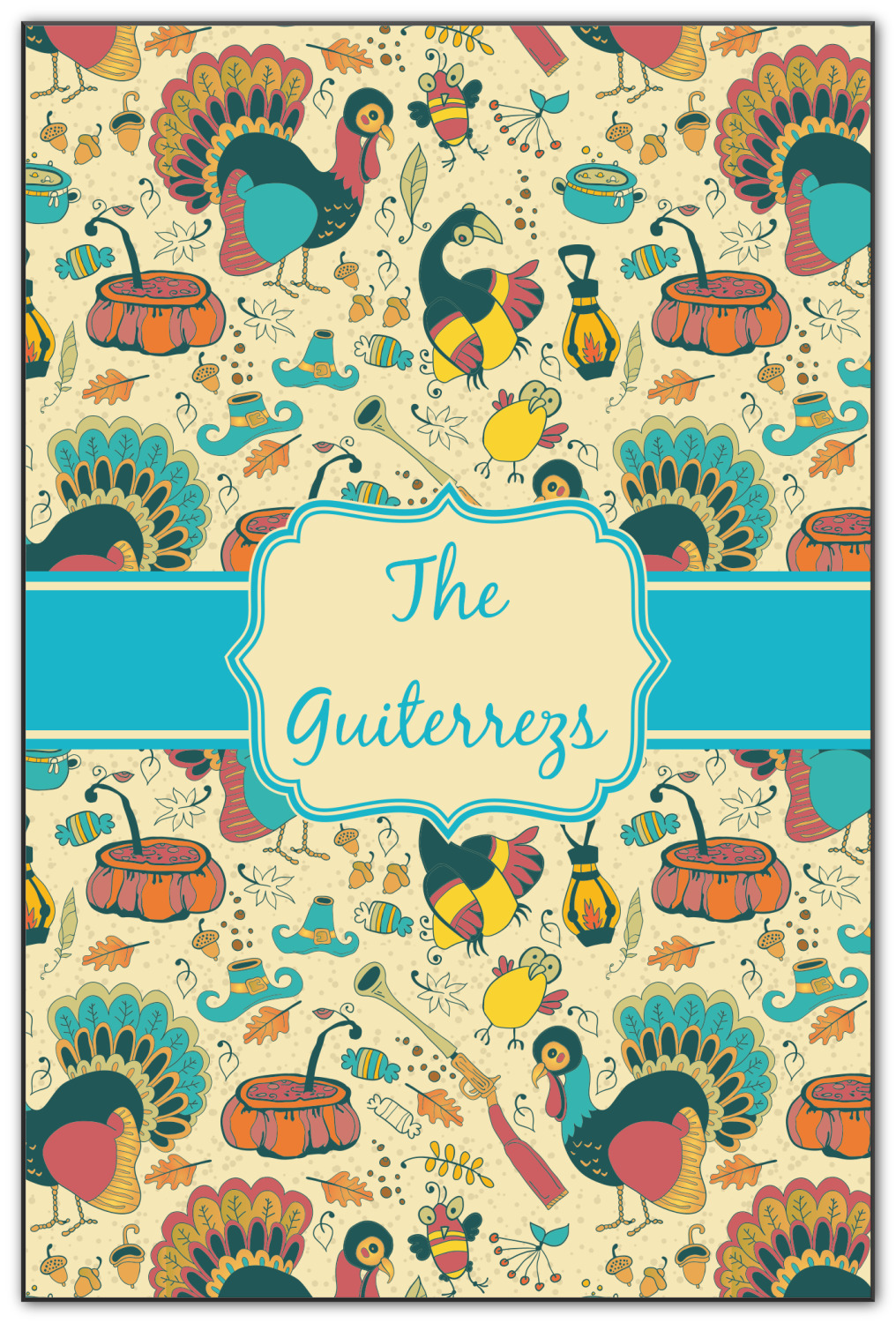 This Old Fashioned Thanksgiving design is hand drawn and includes pictures of turkey, birds, pot of food, lanterns, gun, candy, leaves and acorns; giving it a very old fashioned feel. The design has some of the traditional colors of oranges, reds and yellows, but also has a beautiful teal coloring in the turkey and the pilgrim hat; giving it a chic bold look.