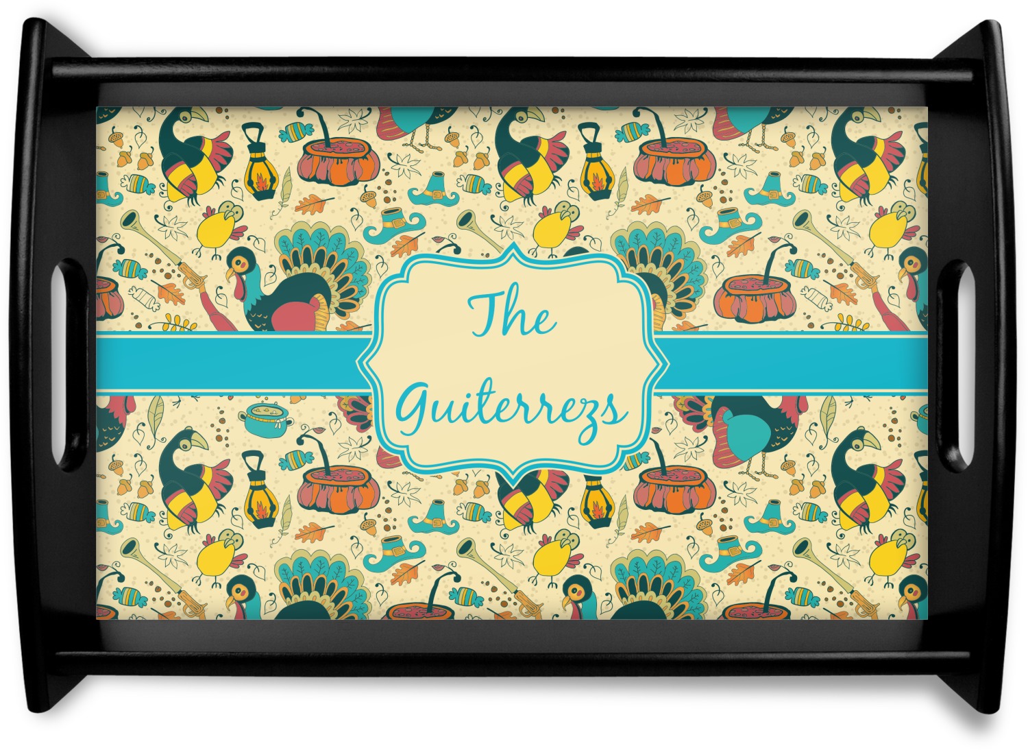 This Old Fashioned Thanksgiving design is hand drawn and includes pictures of turkey, birds, pot of food, lanterns, gun, candy, leaves and acorns; giving it a very old fashioned feel. The design has some of the traditional colors of oranges, reds and yellows, but also has a beautiful teal coloring in the turkey and the pilgrim hat; giving it a chic bold look.