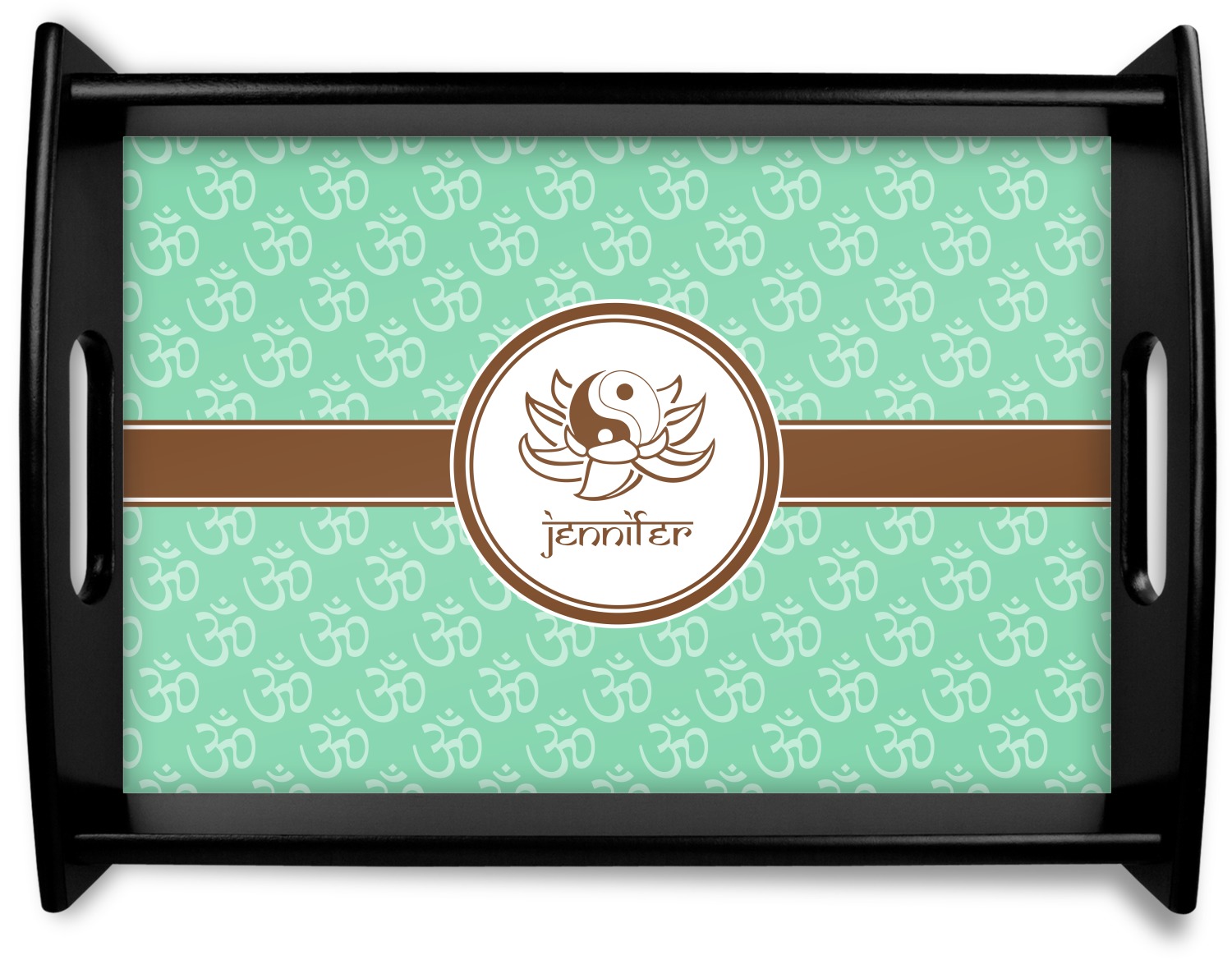 This serving tray with handles features square edges and two rounded sides, creating a very modern look. Each side is fabricated from a beautifully cut, natural wood. The bottom of the interior of the tray displays your customized design in bright, vibrant color. The tray is sold in both a black color and a natural wood look. Each variation of the wood serving tray has two sizes: Small, which is 14" x 10" x 2.25", and Large, which is 19.5" x 13.5" x 2.75".