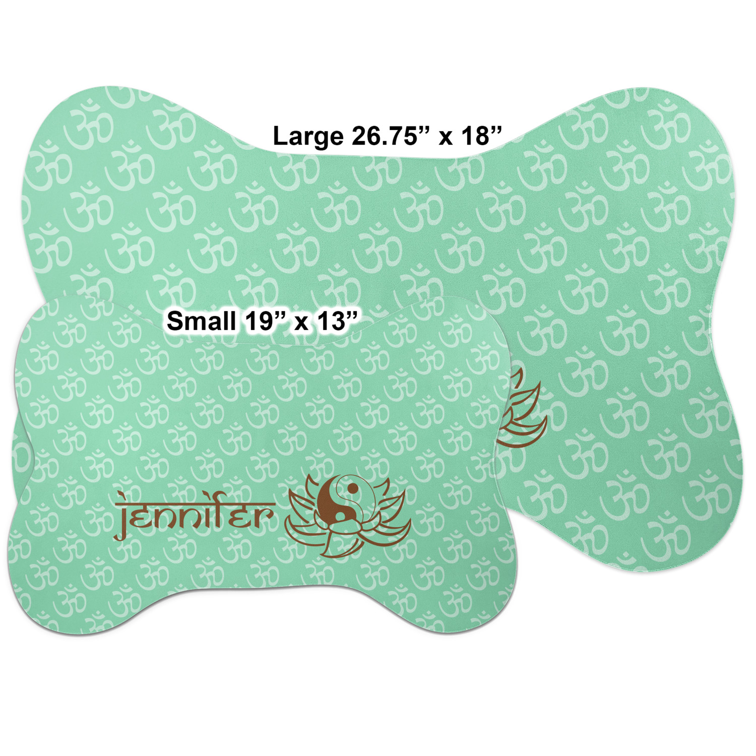 The top of this mat displays your custom design, as it is printed on polyester. To prevent slippage, the underside of the mat is made of rubber. We offer a small dog food mat, suitable for smaller dogs and a large dog food mat for bigger breeds. The small dog food mat is approximately 19 by 13 inches, while the large dog feeding mat measures at approximately 26.75 by 18 inches. Both personalized mats are ideally sized to fit two dog bowls.