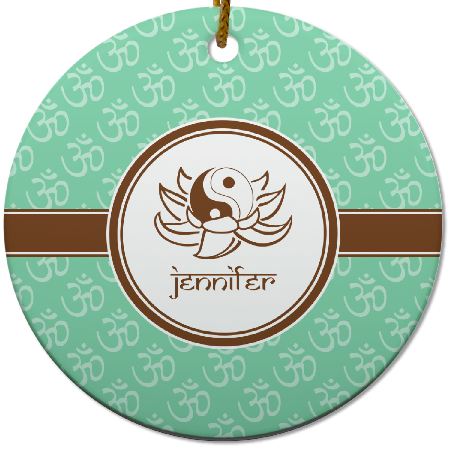 A Yin-Yang symbol is nestled in a lotus flower in the center label. Add the personalization of your choice underneath.