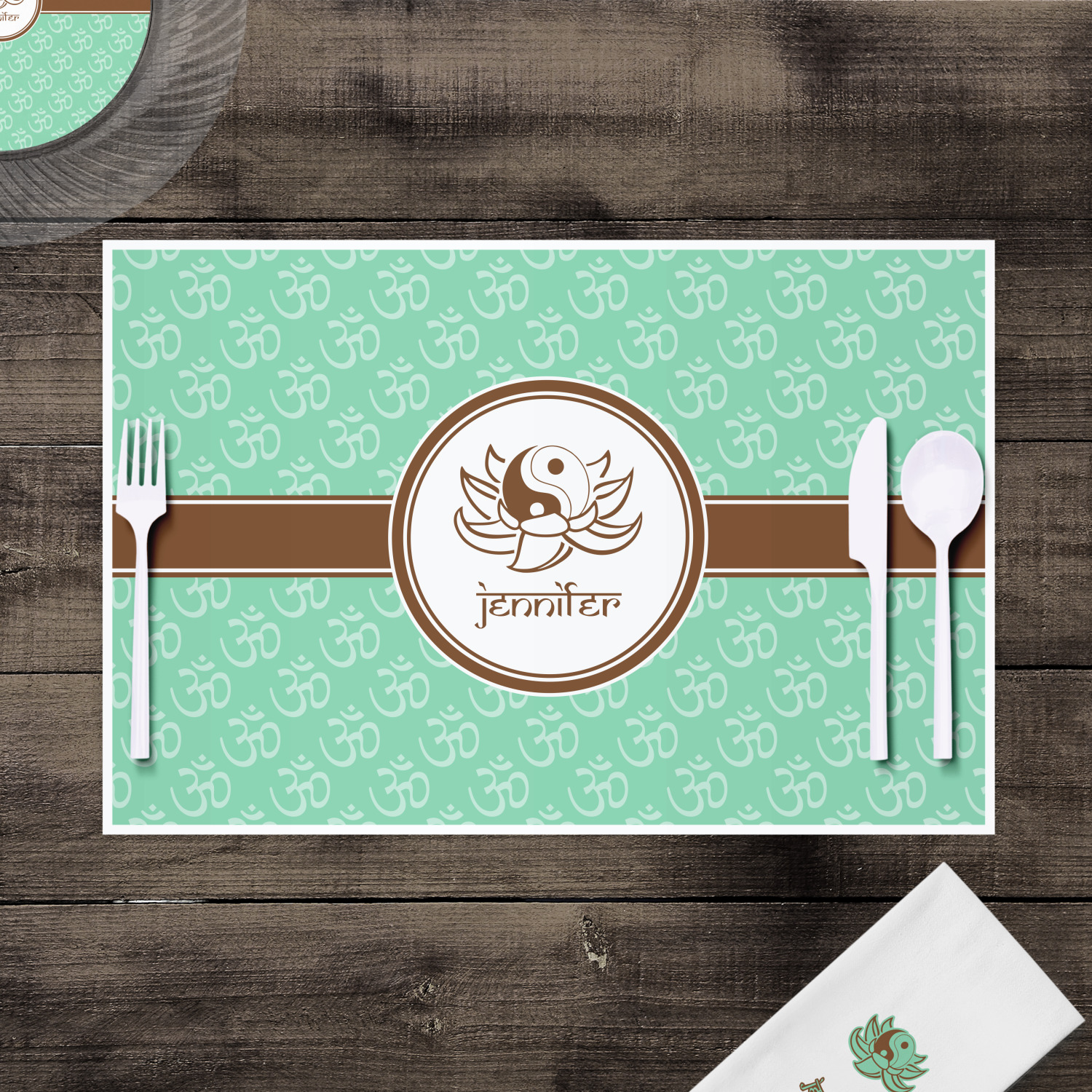 A Yin-Yang symbol is nestled in a lotus flower in the center label. Add the personalization of your choice underneath.
