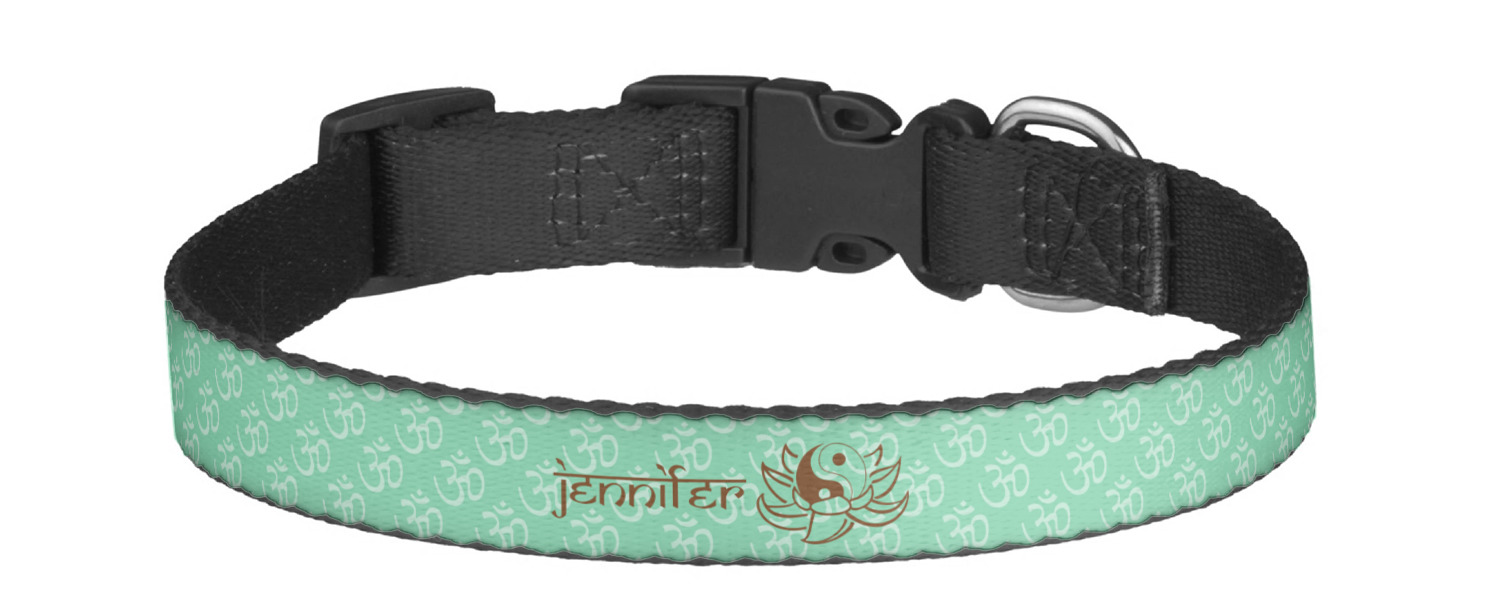 This sturdy collar, made from a durable nylon weave, will outlive your dog's episodes of excited tugging and pulling. Courtesy of its thick plastic buckle and adjuster, this collar is adjustable and accommodating of any dog. Structurally, the collar is a single piece of nylon weave that is sewn together, and features a solid metal loop where you can attach a leash or dog tag. We print and display your dog's name and pattern across the middle of the personalized dog collar.
