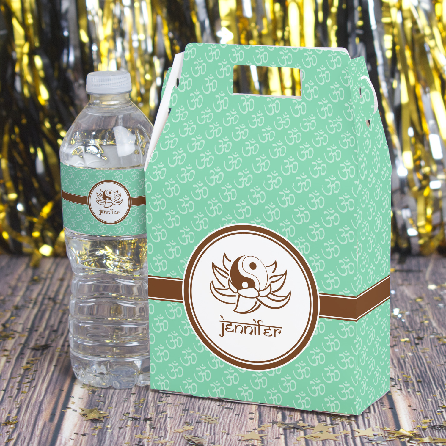 A Yin-Yang symbol is nestled in a lotus flower in the center label. Add the personalization of your choice underneath.