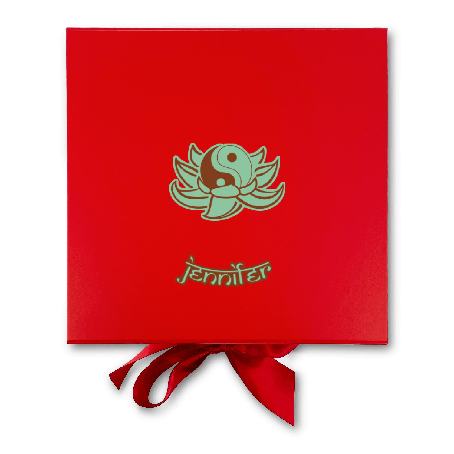 A Yin-Yang symbol is nestled in a lotus flower in the center label. Add the personalization of your choice underneath.
