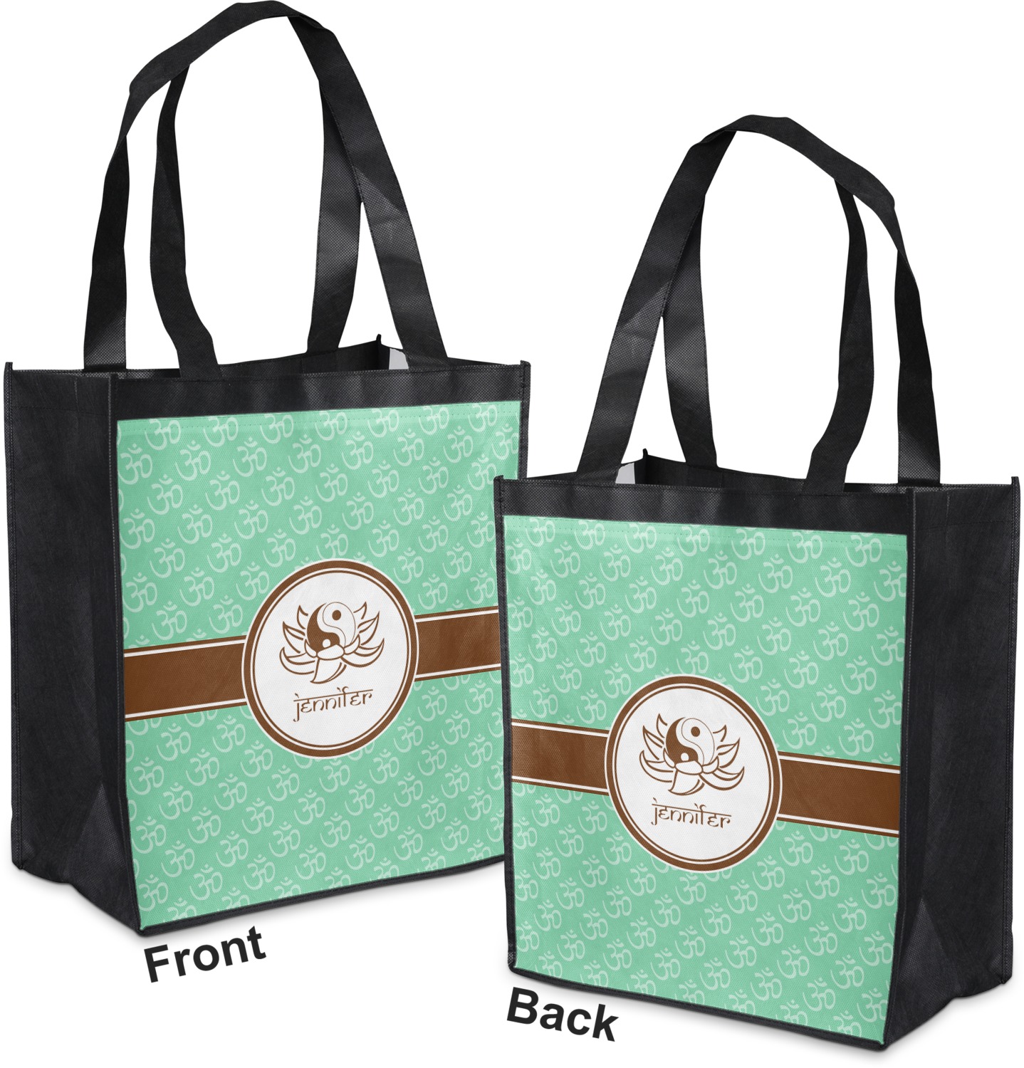 Made from a durable, biodegradable material, these reusable shopping bags can support up to 30 pounds of weight. With two large handles, measuring at 8.5 inches each, these personalized tote bags are easy to carry to your vehicle or home. The bag itself is 12 by 13.5 inches, and can expand to a depth of 7 inches. Your customization is printed on both the front and back, while the remaining sides, trim, and handle are a sleek, charcoal black.