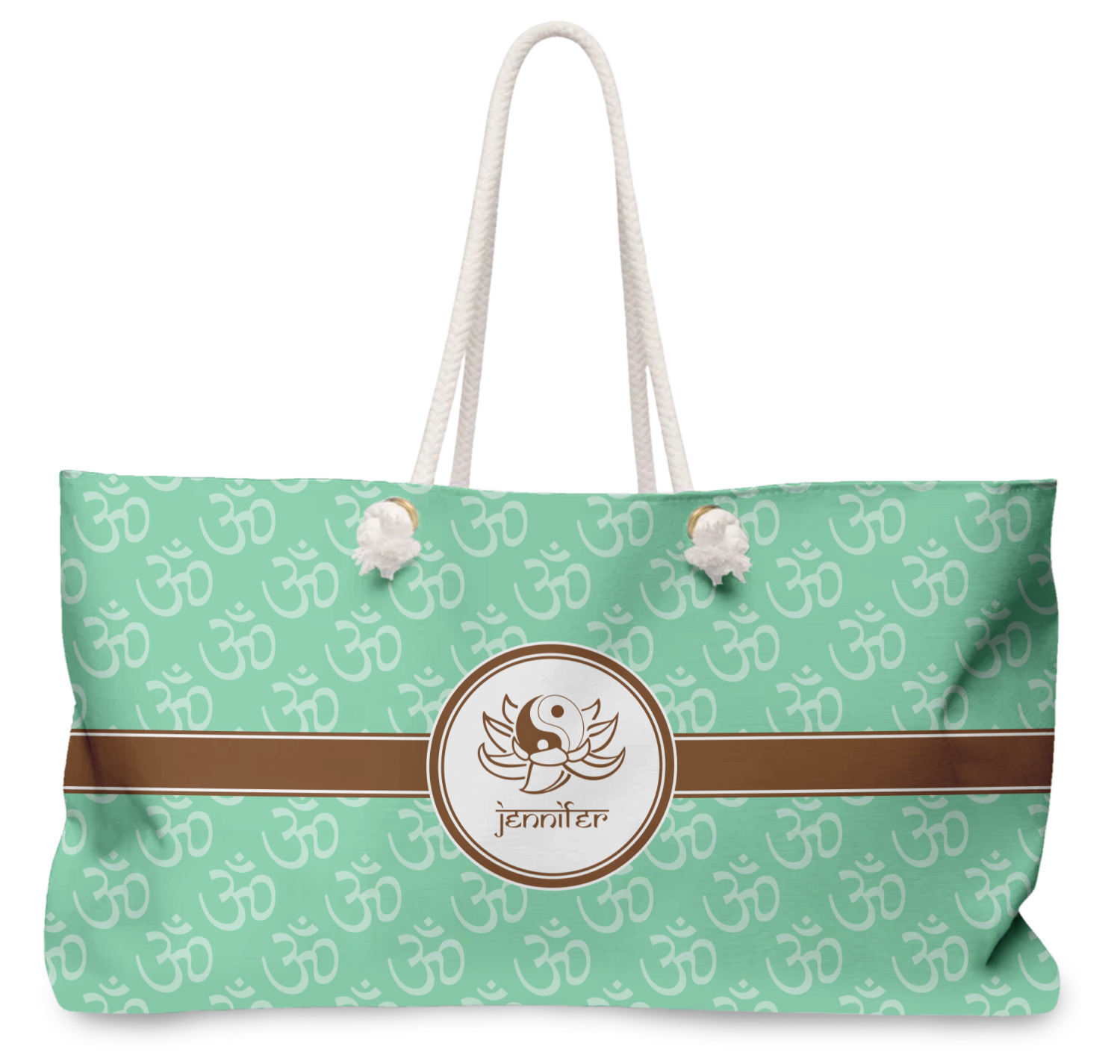 Our oversized weekender tote with rope handles is perfect for your weekend at the beach or on the town. This large tote are 24" W X 13" H, with a 5" gusset and a 27" thick rope handles with a knot that is put through a grommeted brass hole.