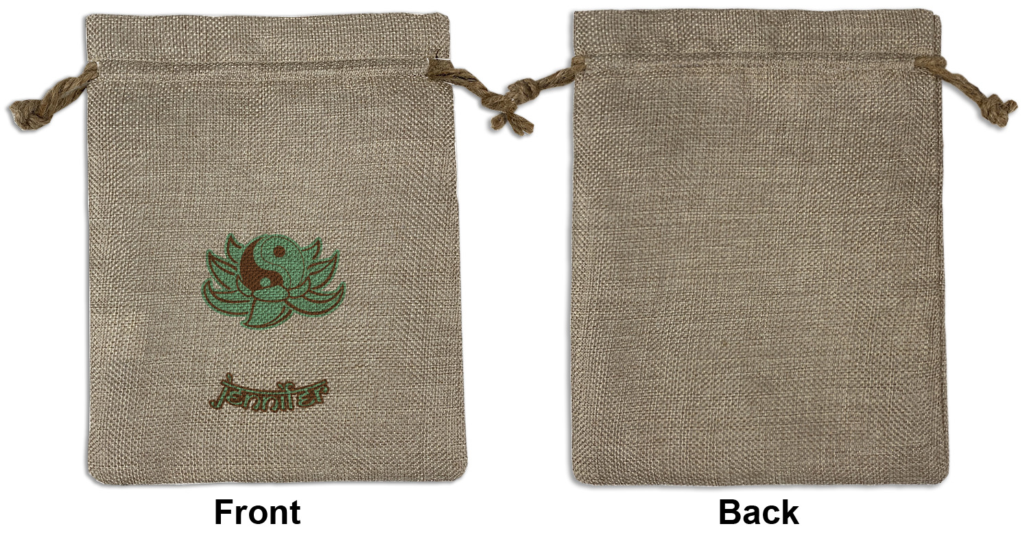 We sell our Burlap Gift Bags in 3 variant sized bags. Made with burlap polyester, each personalized bag can be secured with a twine drawstring pull. Your custom design is available to print on one side or both sides - completely up to you! The sizes of the bags measure approximately 4.5" x 6.5" for the smallest size, 6.5" x 8.0" for the medium size, and 6.5" x 13.5" for the large-sized bag.