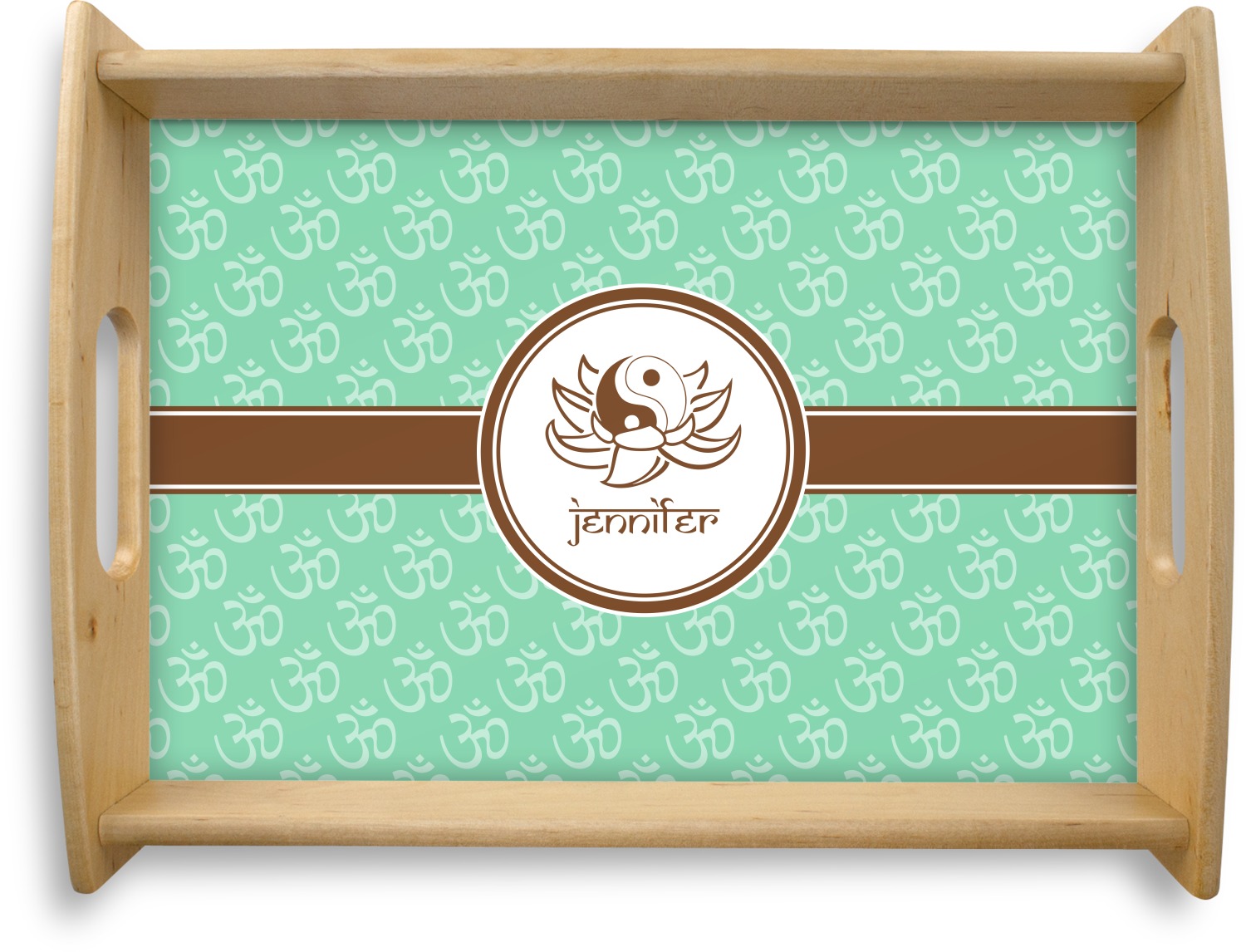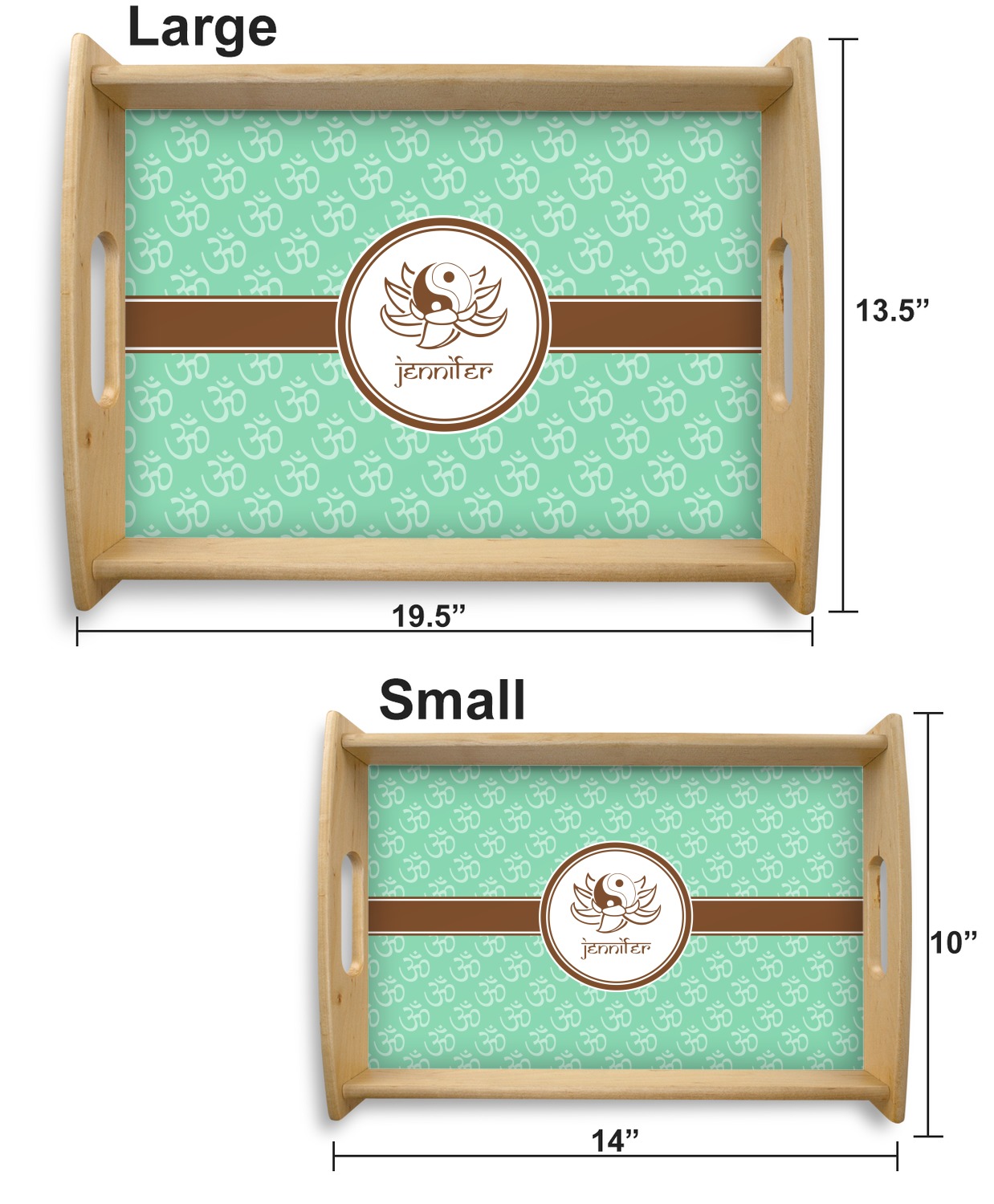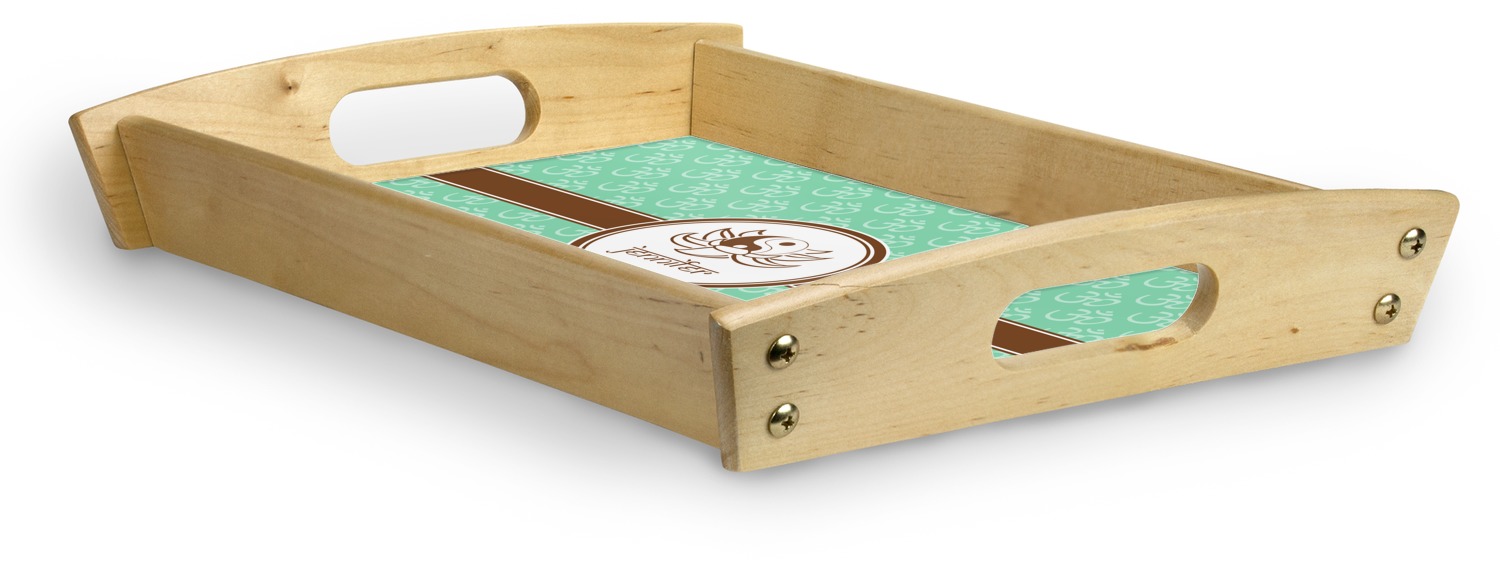 This serving tray with handles features square edges and two rounded sides, creating a very modern look. Each side is fabricated from a beautifully cut, natural wood. The bottom of the interior of the tray displays your customized design in bright, vibrant color. The tray is sold in both a black color and a natural wood look. Each variation of the wood serving tray has two sizes: Small, which is 14" x 10" x 2.25", and Large, which is 19.5" x 13.5" x 2.75".