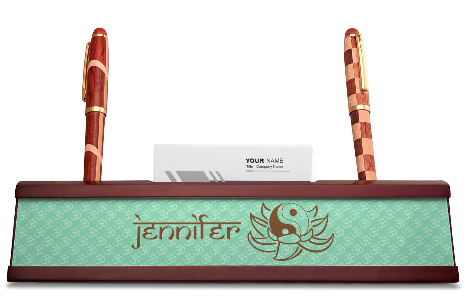 Your desk name plates are crafted from a high-quality, dark-cherry mahogany. At approximately 9.5 by 1.875 by 2.5 inches, this name plaque will fit perfectly, front and center, on your desk. Your customization spans across the entire face of the nameplate. Behind the nameplate lies a skinny slot that can fit approximately 15, traditionally-sized, business cards. You can also store your writing utensils on either side of this custom desk name plate.