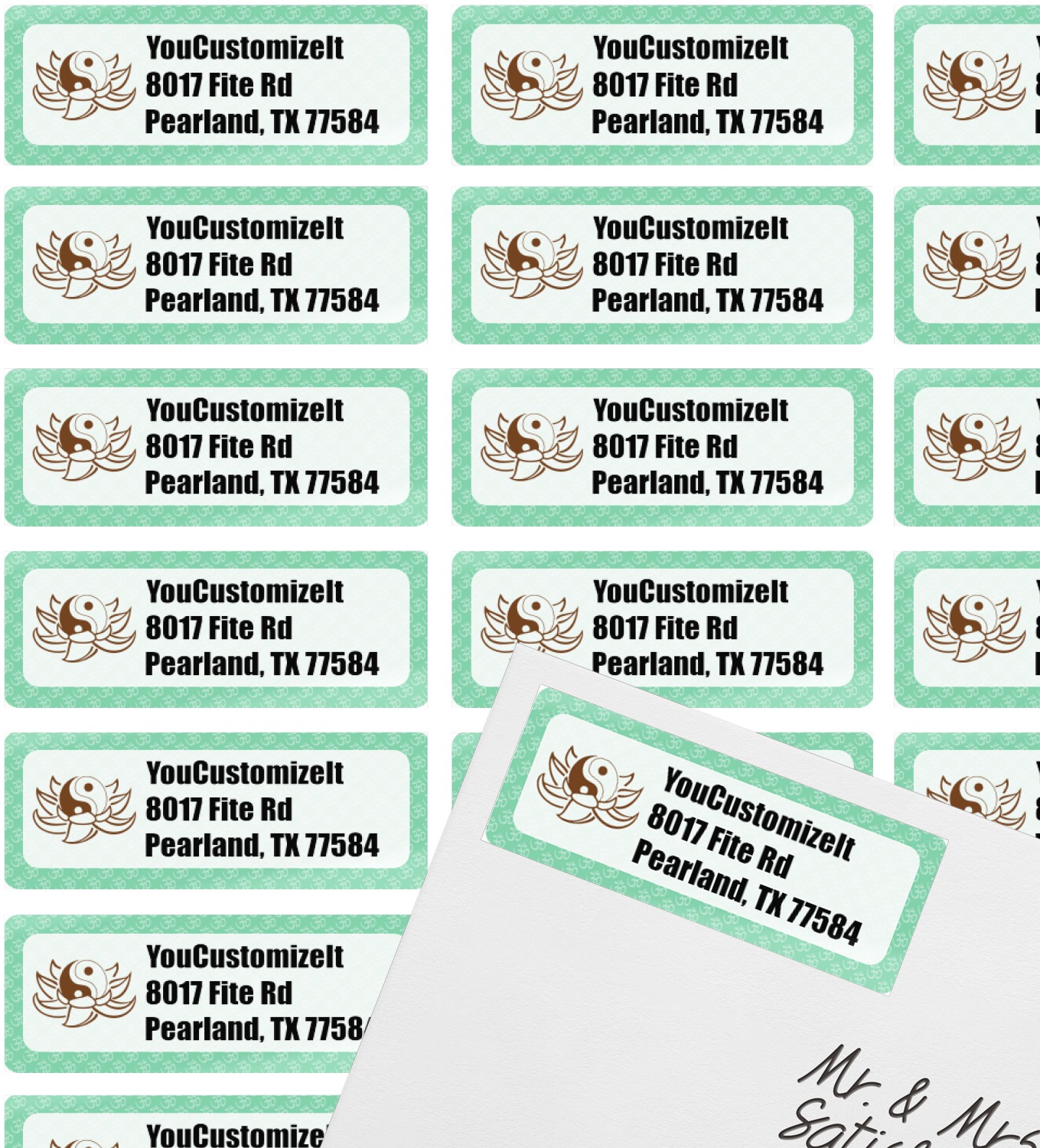 A Yin-Yang symbol is nestled in a lotus flower in the center label. Add the personalization of your choice underneath.