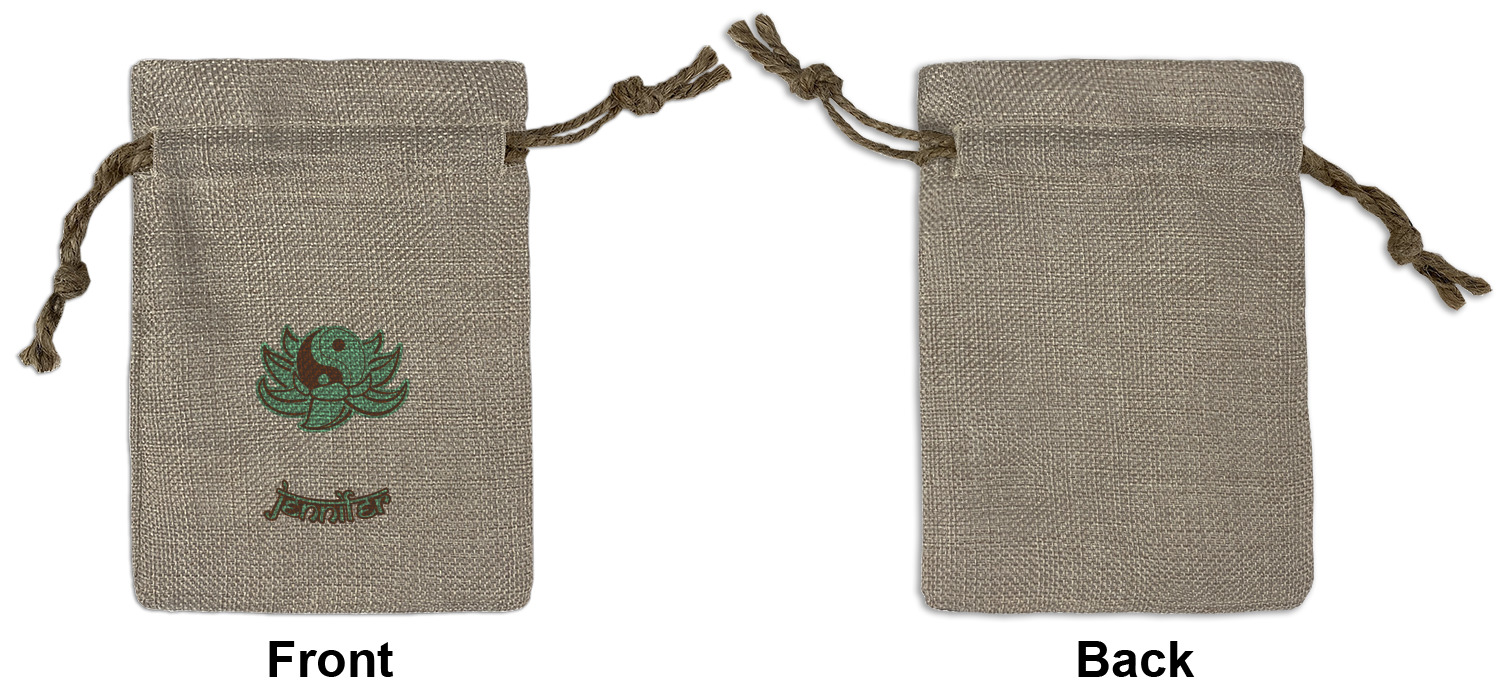 We sell our Burlap Gift Bags in 3 variant sized bags. Made with burlap polyester, each personalized bag can be secured with a twine drawstring pull. Your custom design is available to print on one side or both sides - completely up to you! The sizes of the bags measure approximately 4.5" x 6.5" for the smallest size, 6.5" x 8.0" for the medium size, and 6.5" x 13.5" for the large-sized bag.